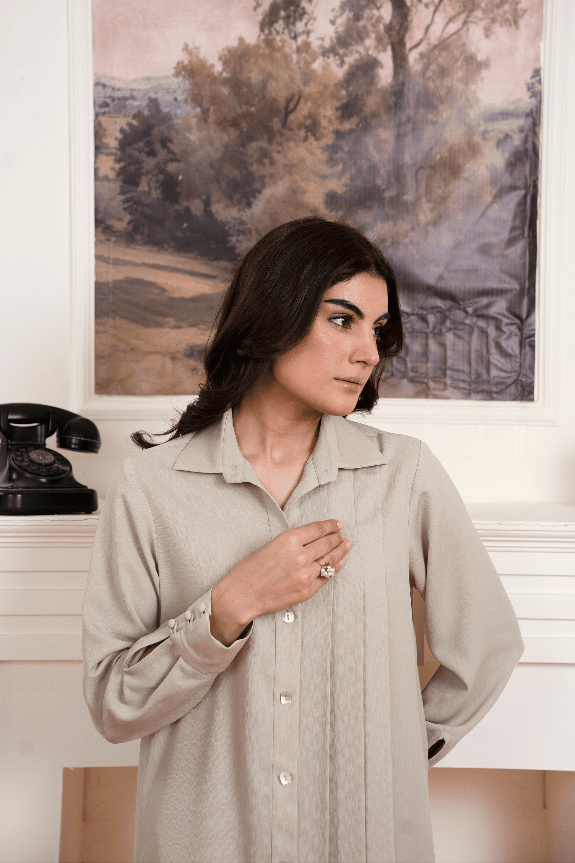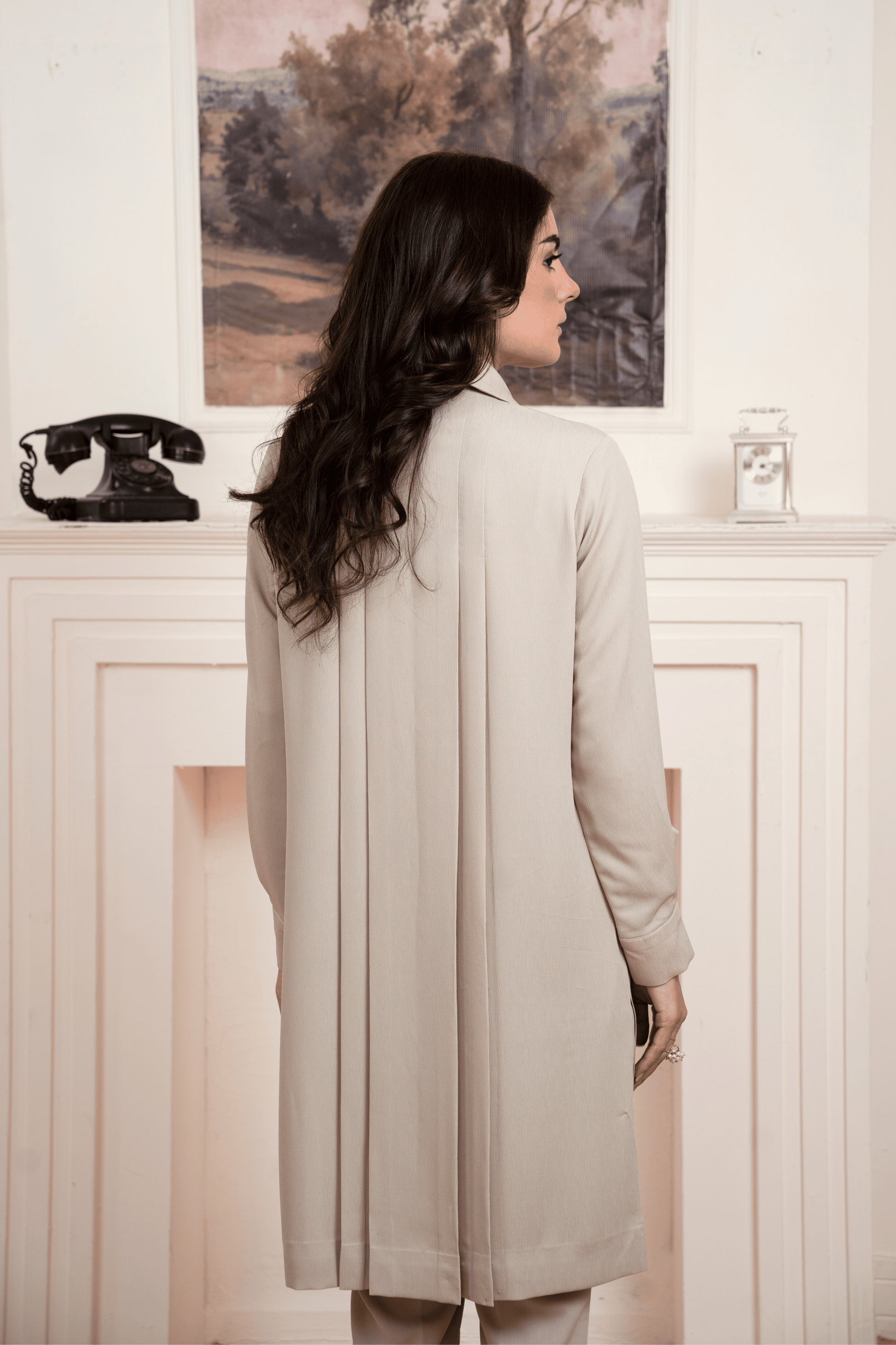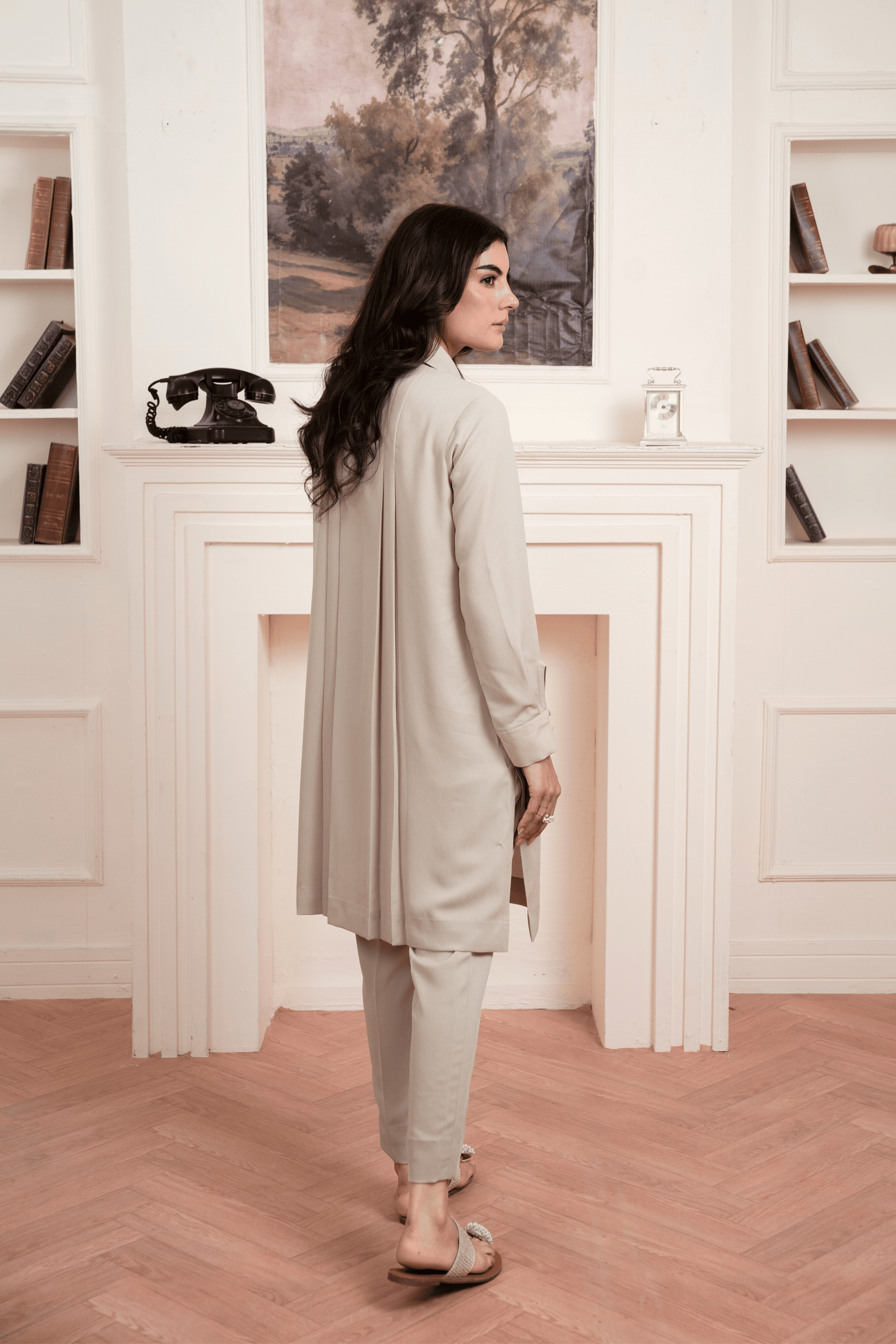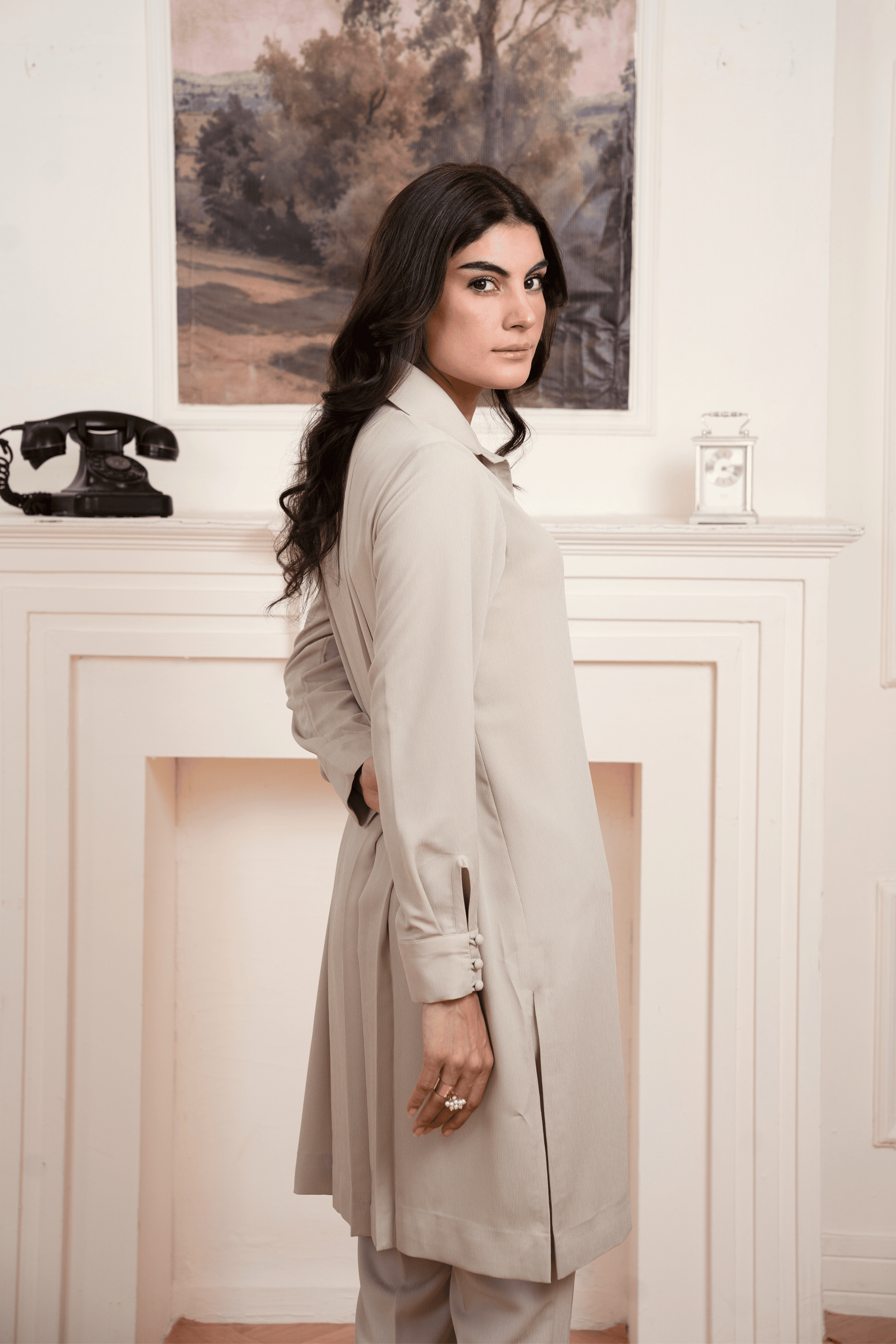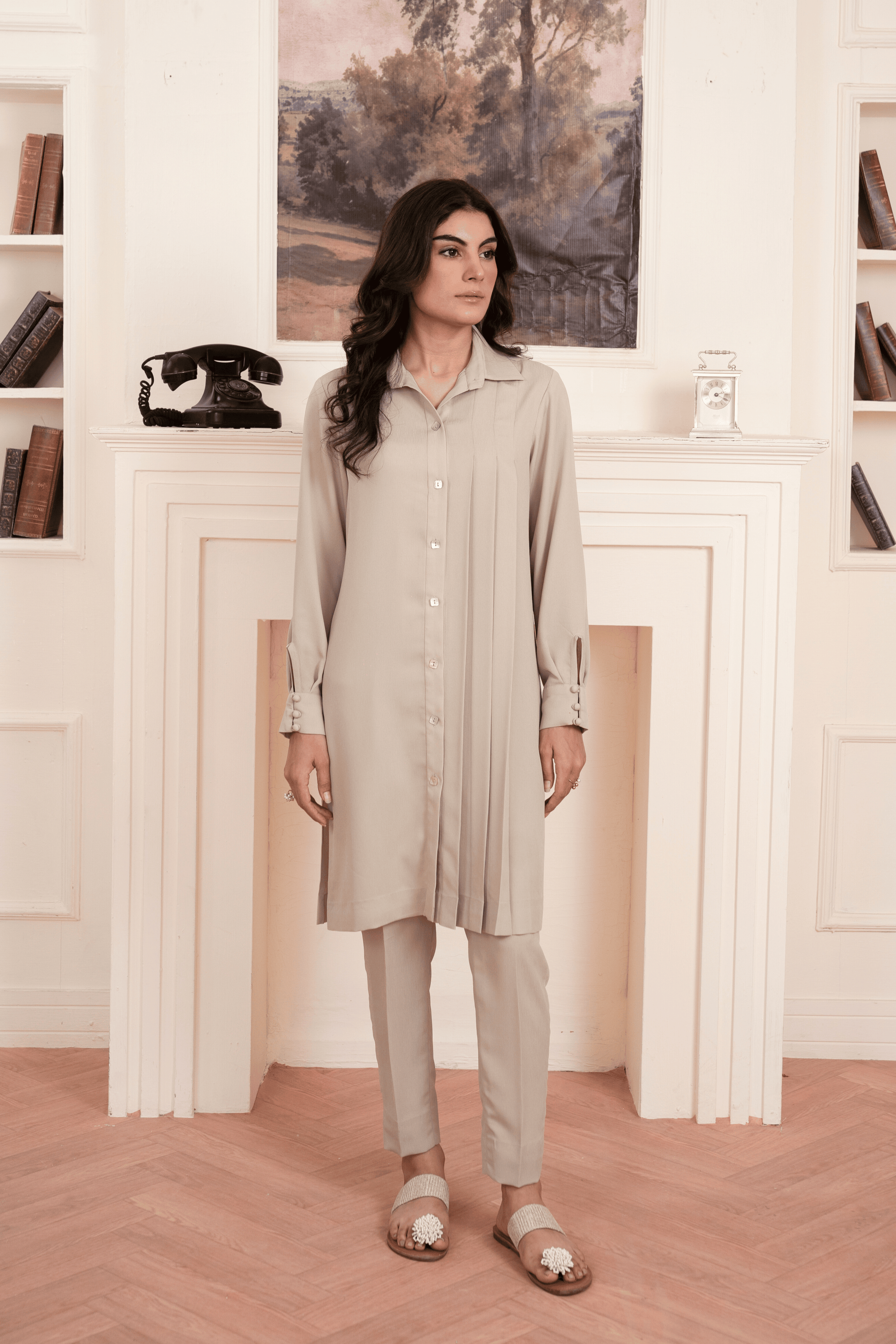 Confection: Two Pcs Loose Fit Shirt with Capri Trouser biassed pleats, stand collar.