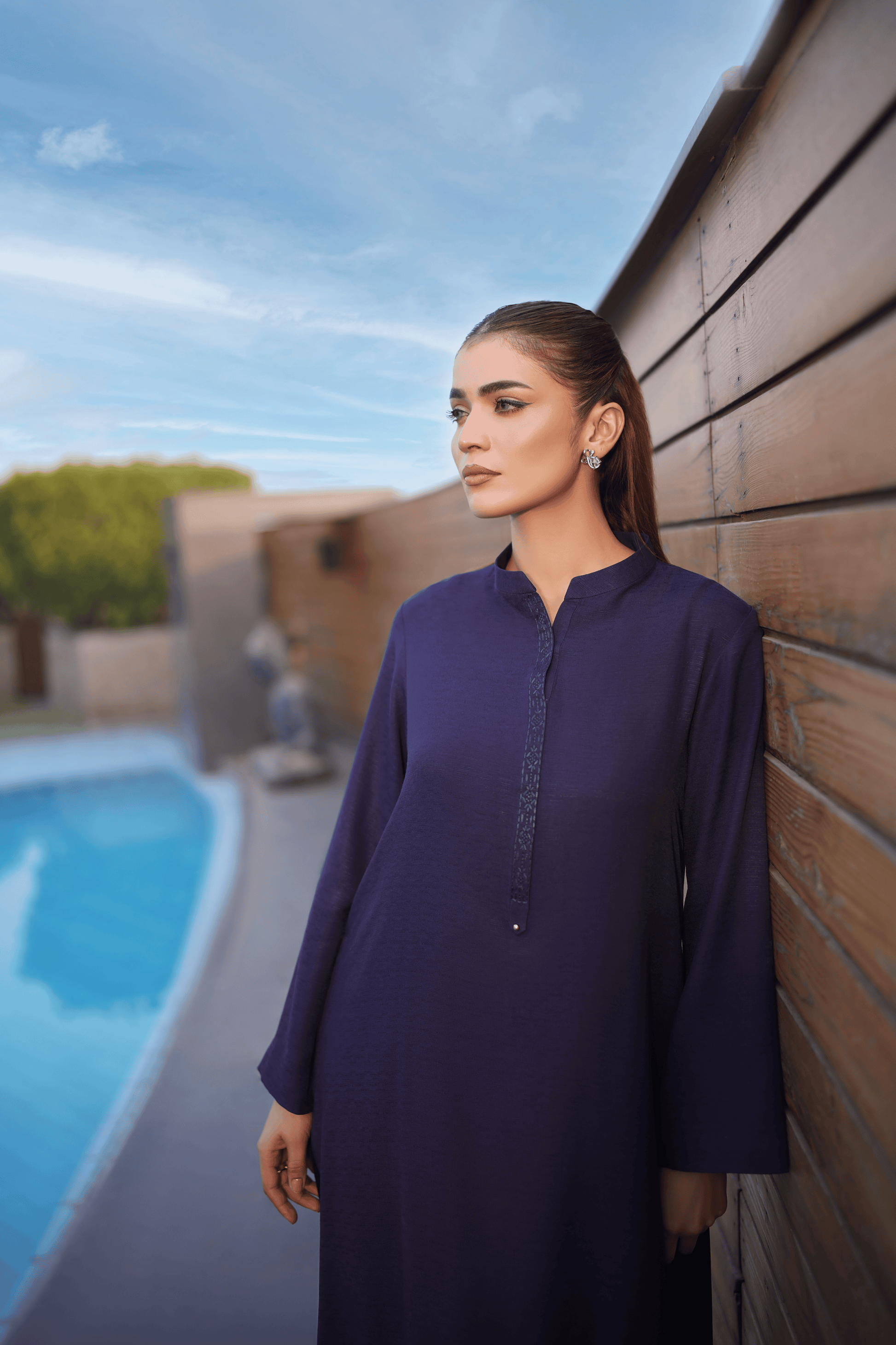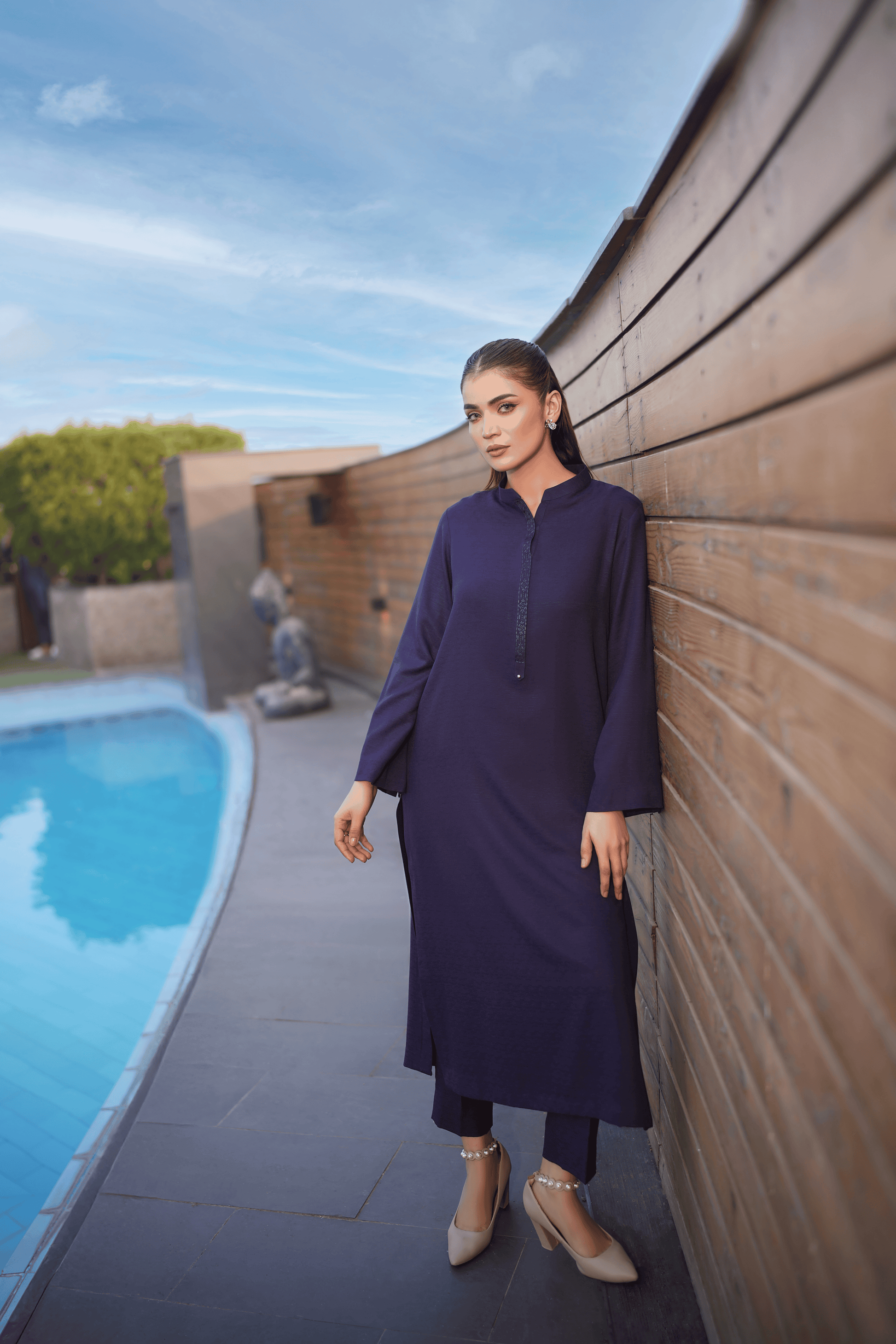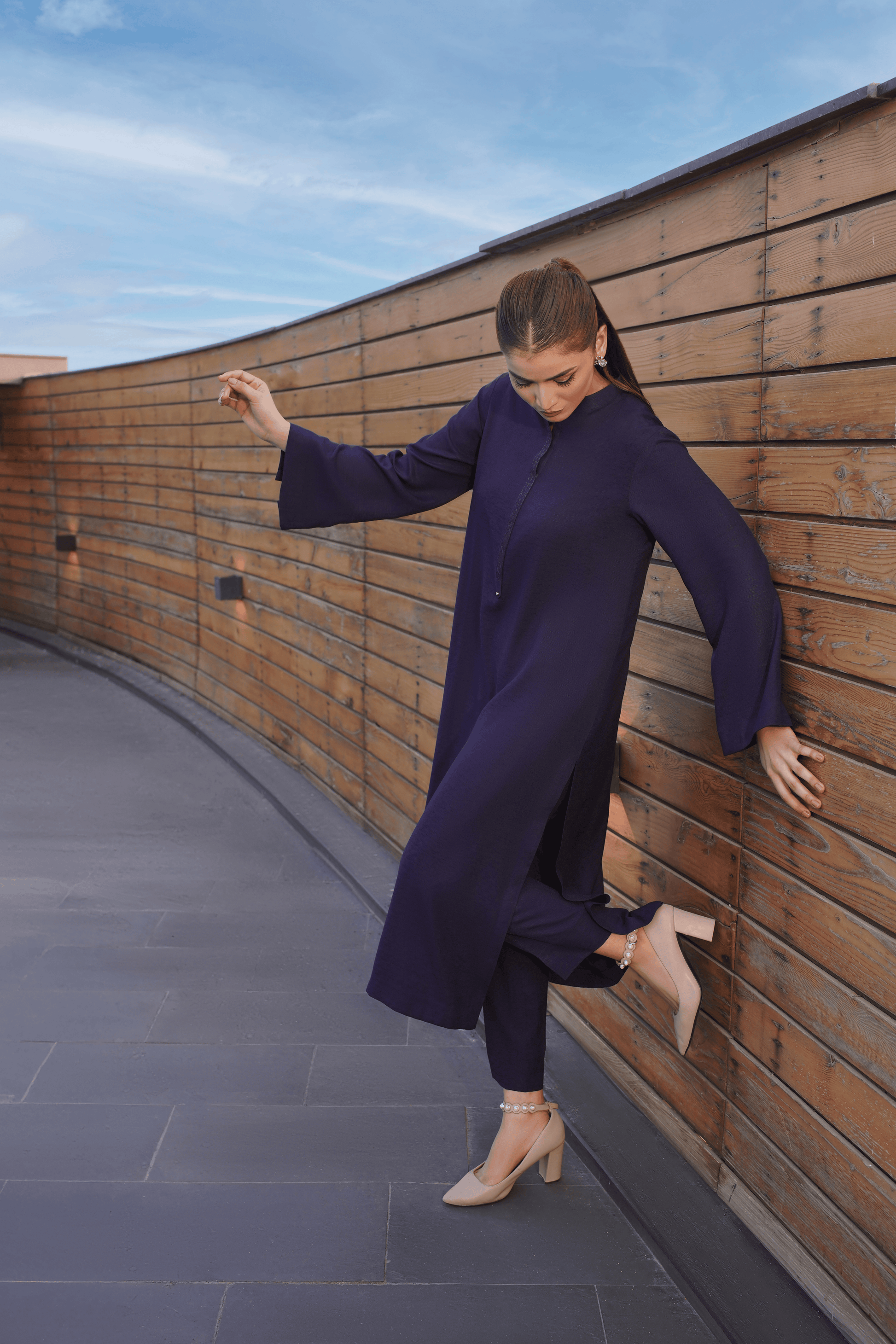 Confection: The design maintains a clean, straight silhouette and features a traditional yet elegant band collar (Mandarin collar). The neckline is adorned with a delicate, contrasting embellished placket that runs down the center, adding a touch of tailored sparkle. The sleeves are full-length and finished cleanly.