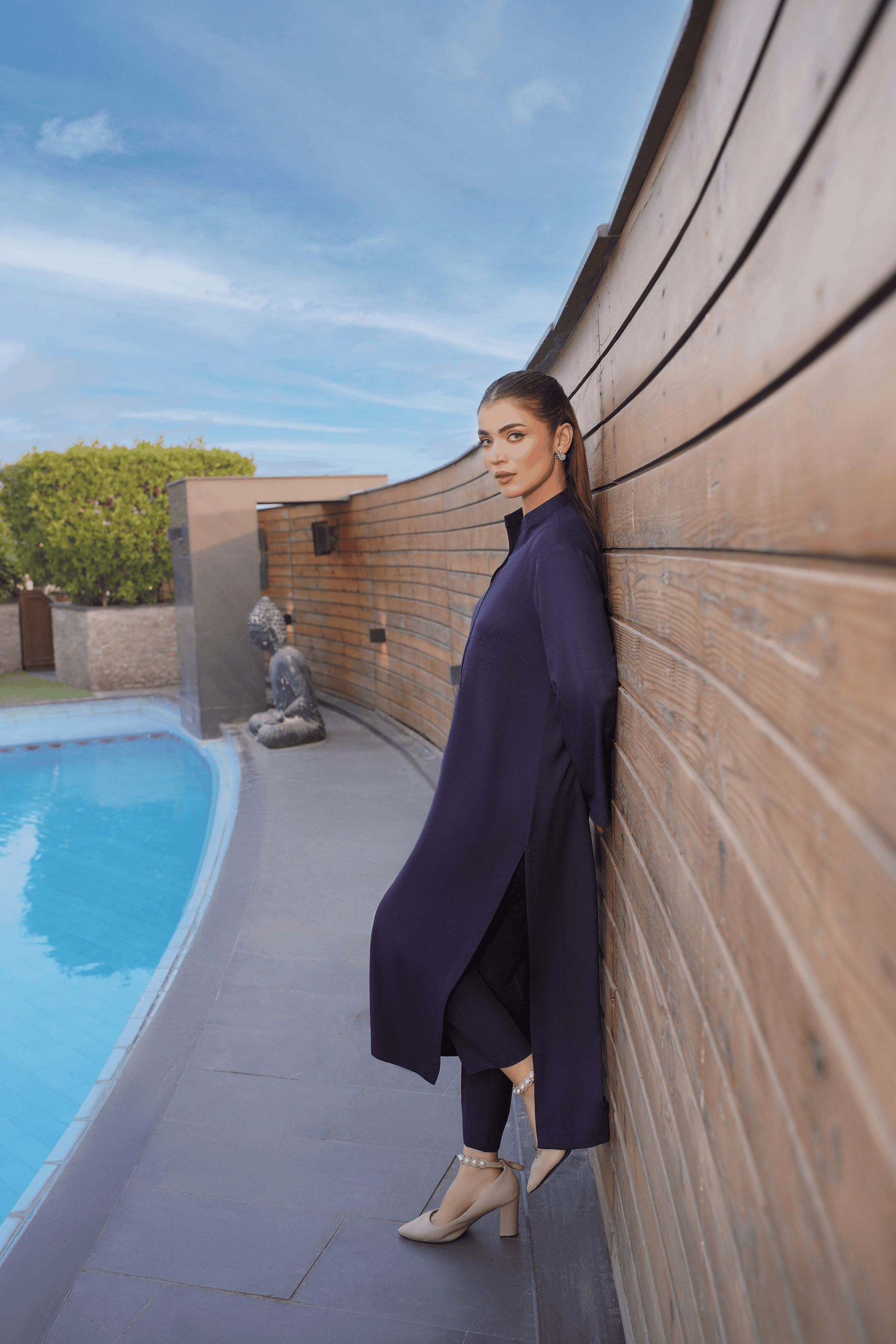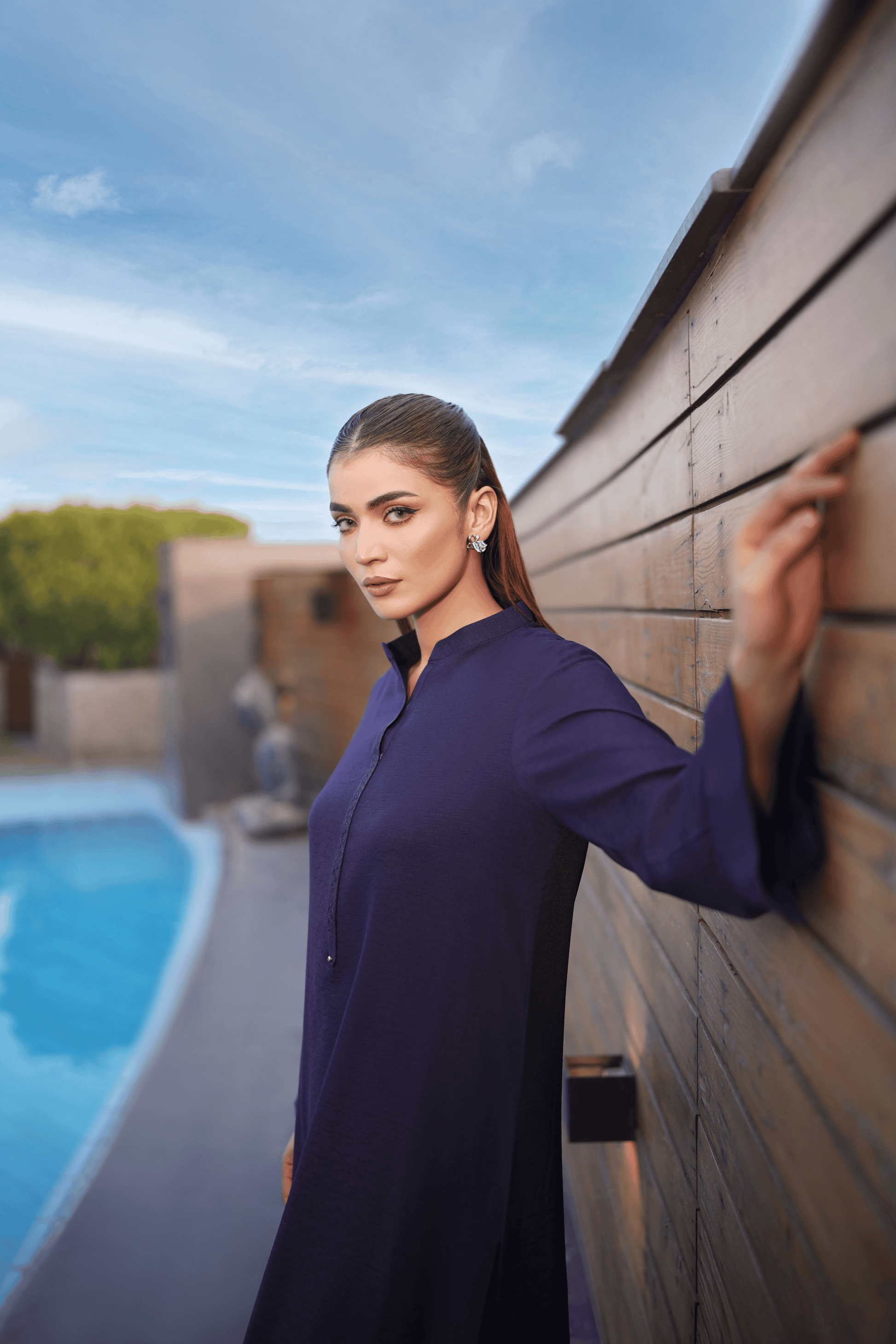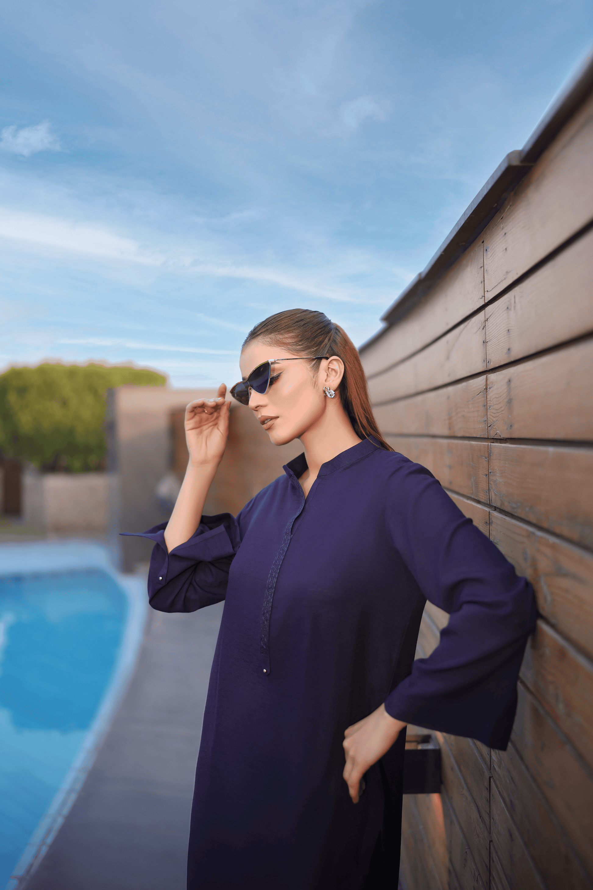 Confection: The design maintains a clean, straight silhouette and features a traditional yet elegant band collar (Mandarin collar). The neckline is adorned with a delicate, contrasting embellished placket that runs down the center, adding a touch of tailored sparkle. The sleeves are full-length and finished cleanly.