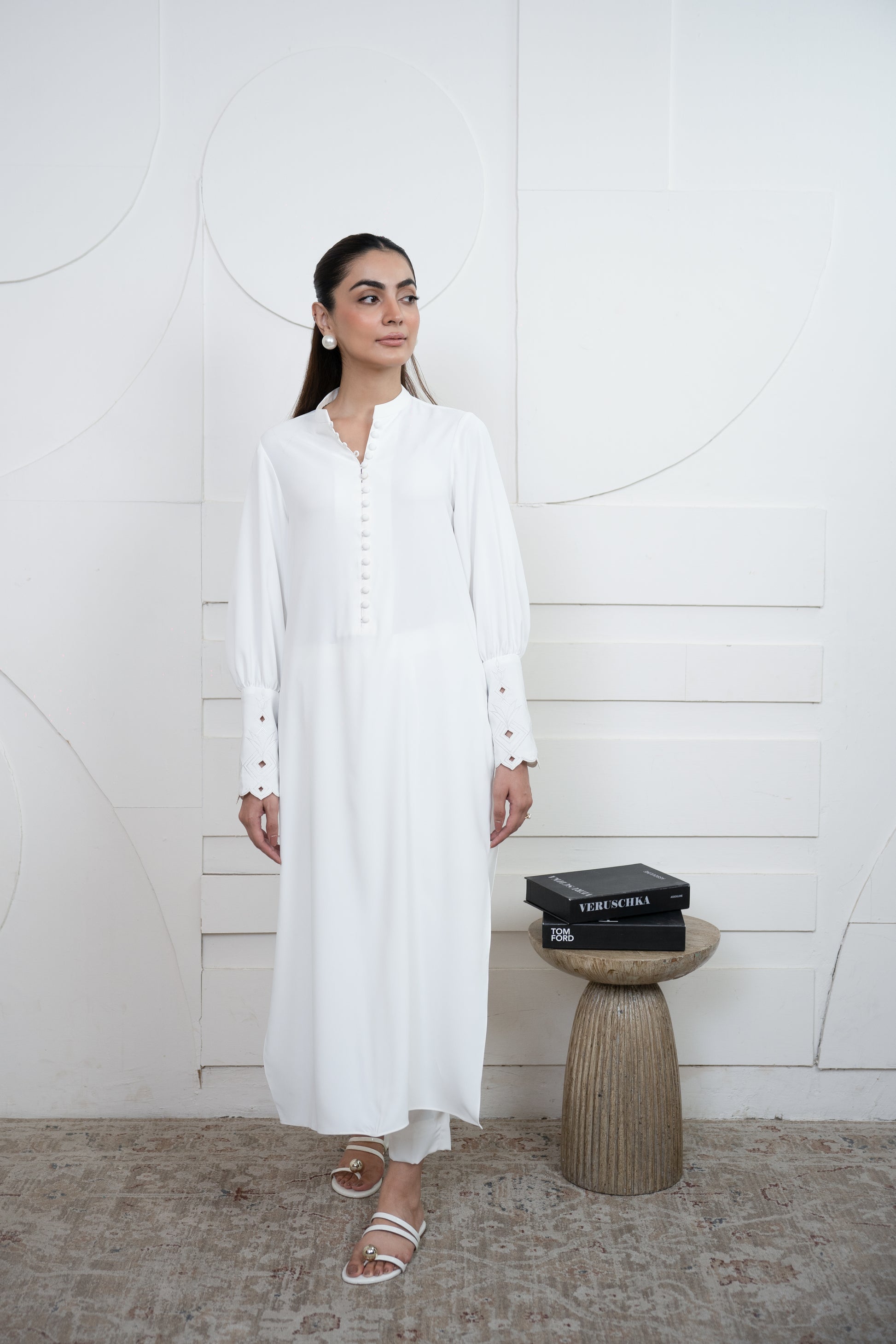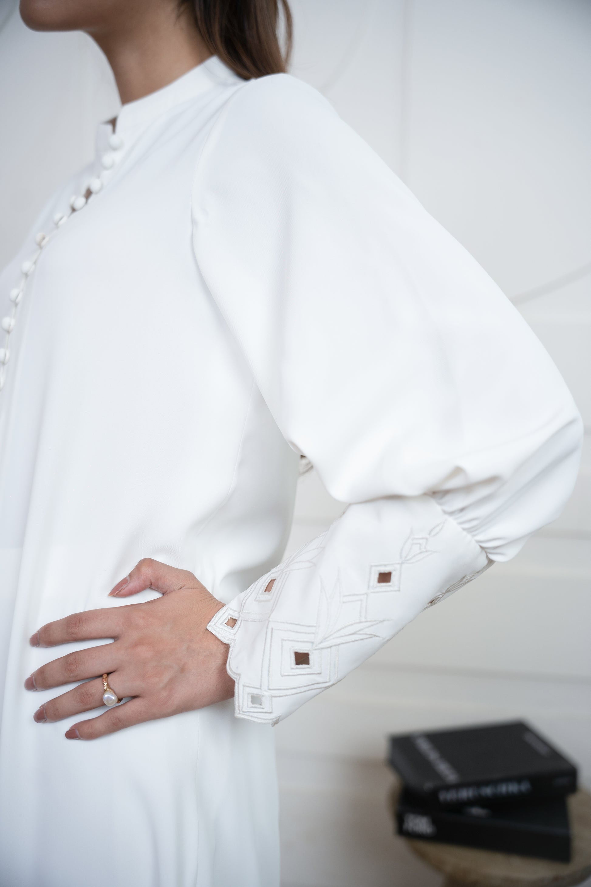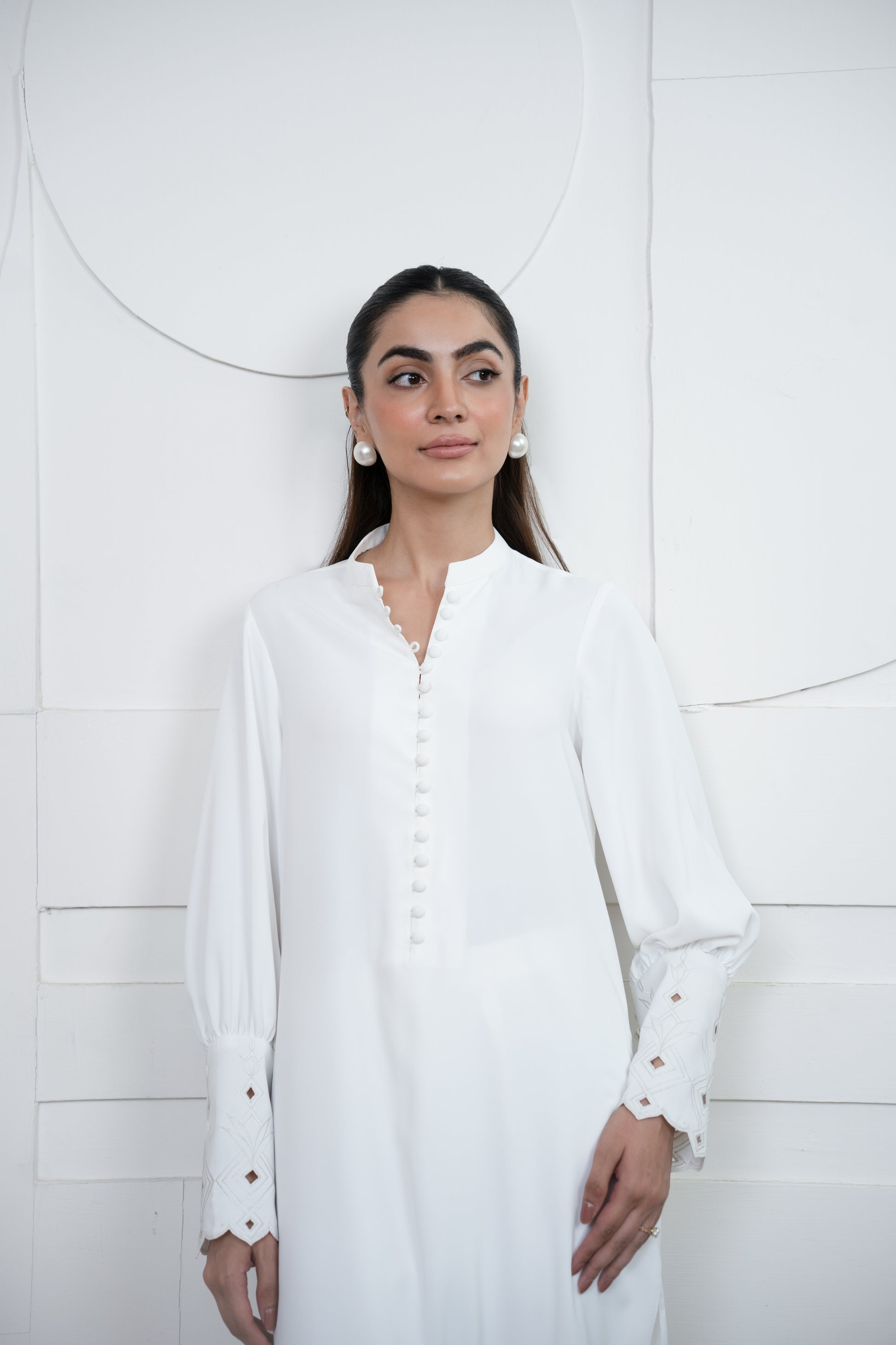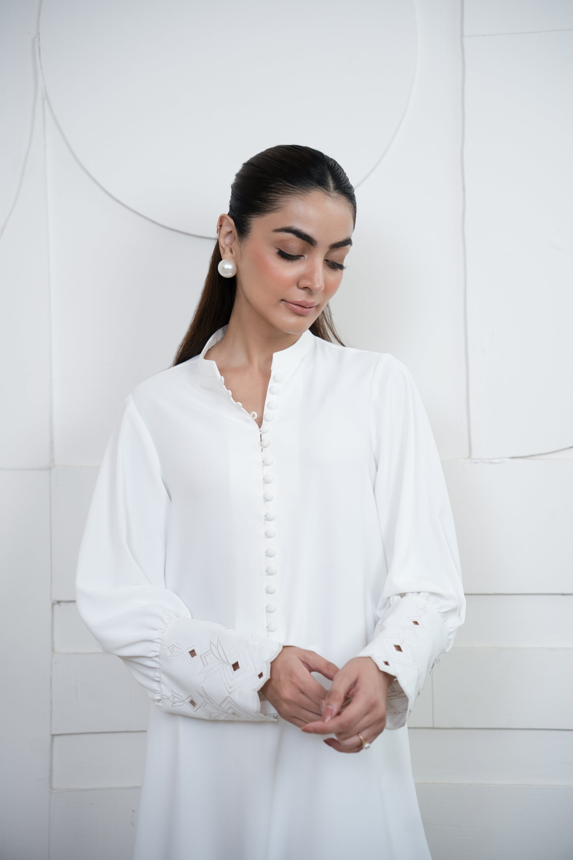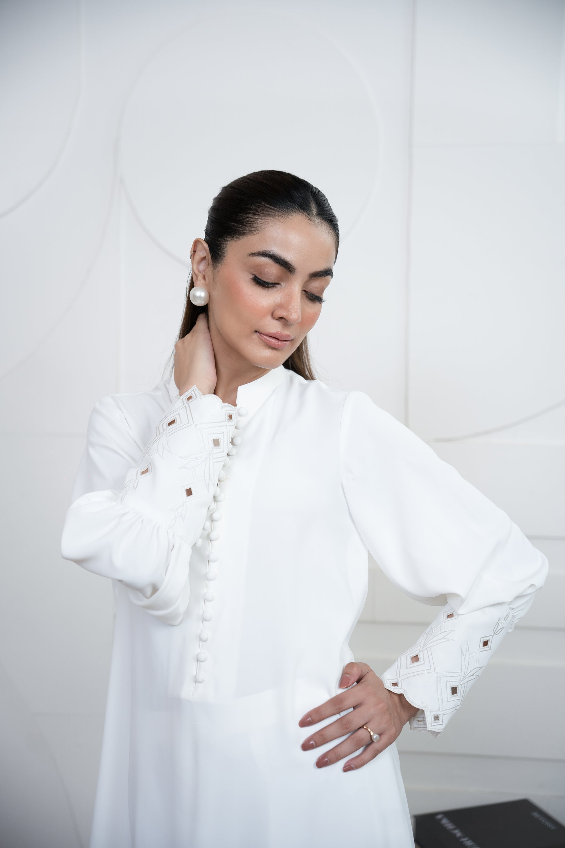 Where white purity meets poise — an ode to timeless refinement, defined by fluid lines, hand-detailed geometric cuffs, and the quiet confidence of minimalism.