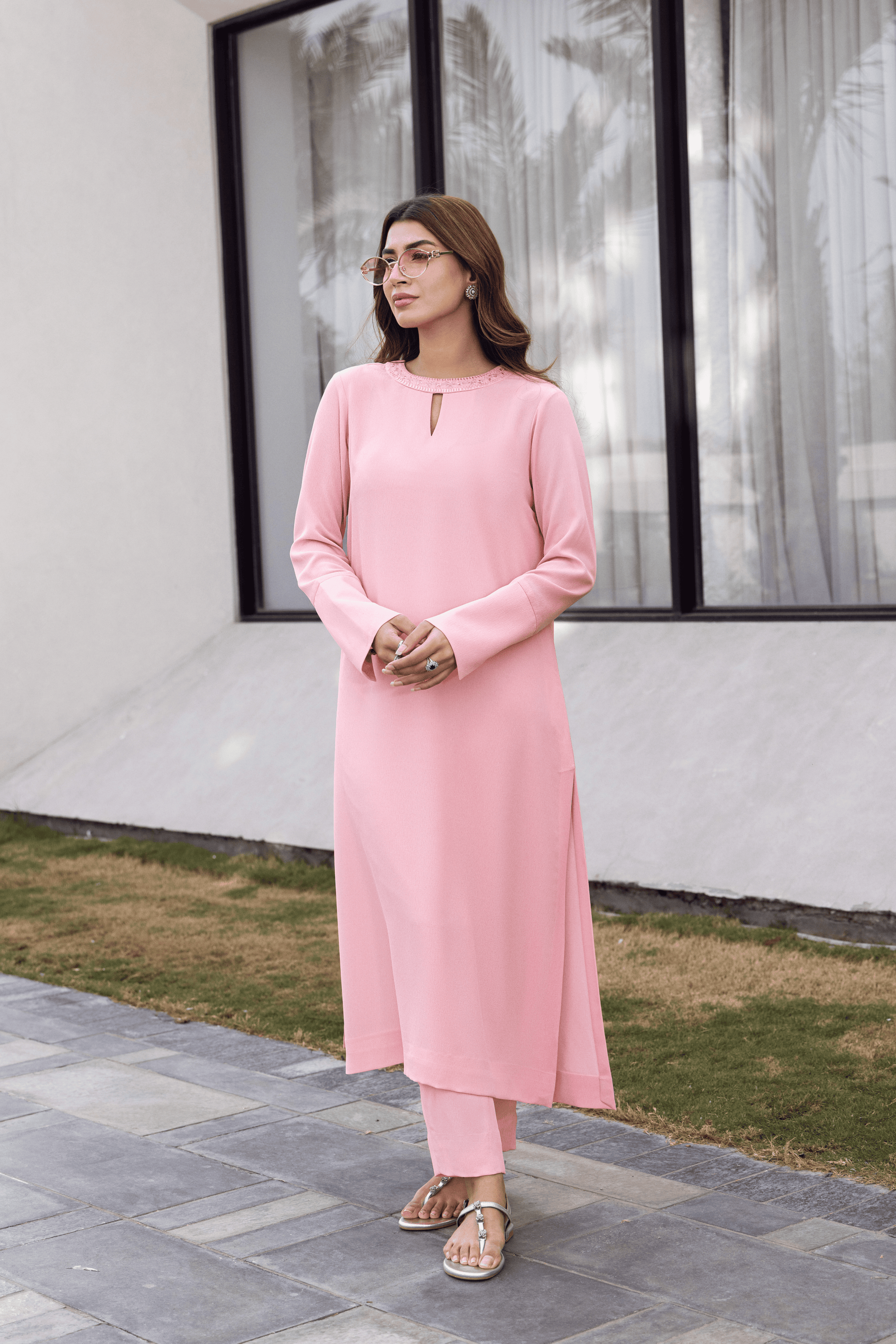 The intricately embellished neckline adds subtle luminosity, while the clean structure and tailored cuffs maintain a modern balance. Perfect for intimate gatherings, daytime celebrations, or elevated everyday wear — this piece speaks in gentle sophistication.