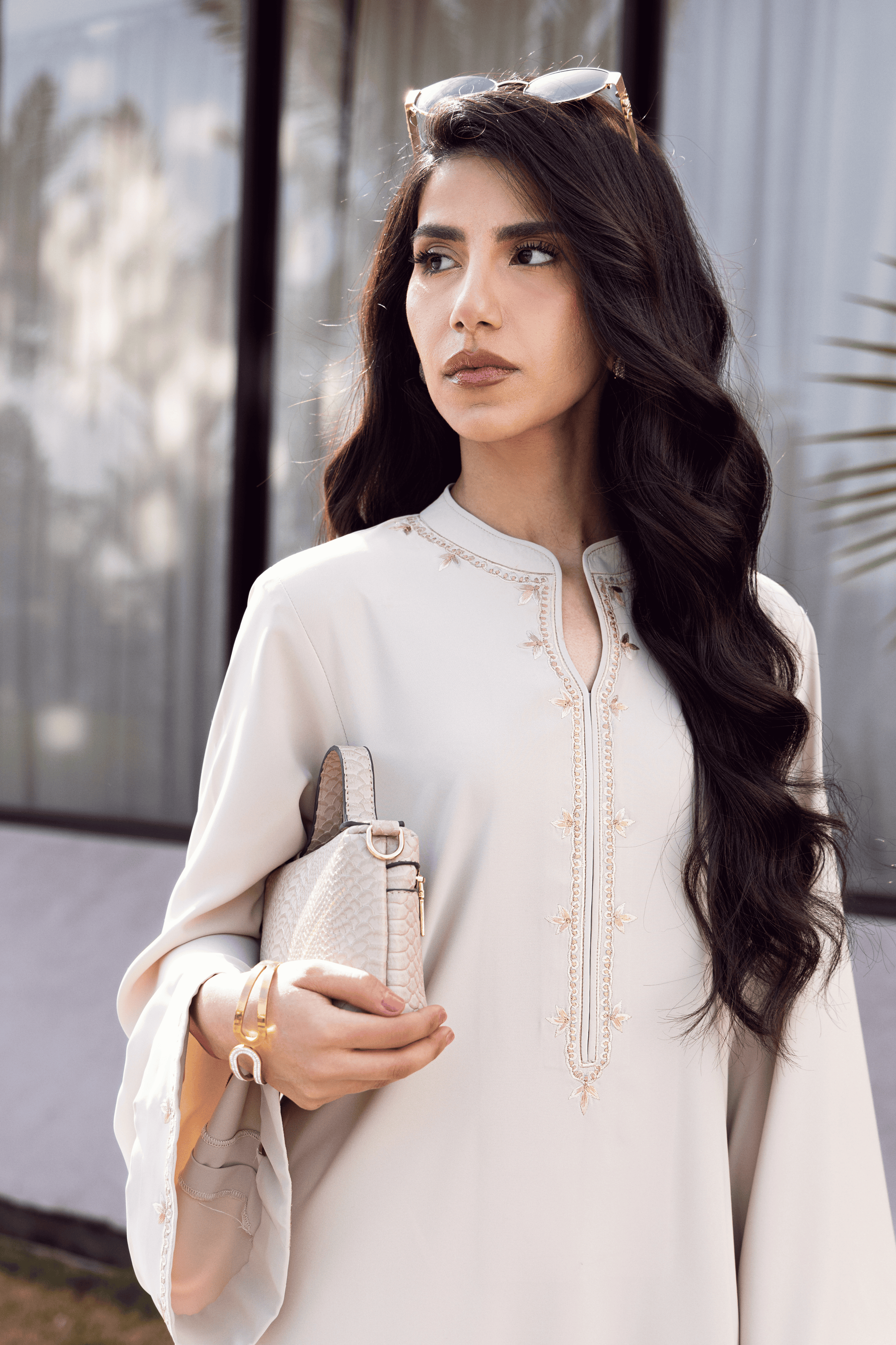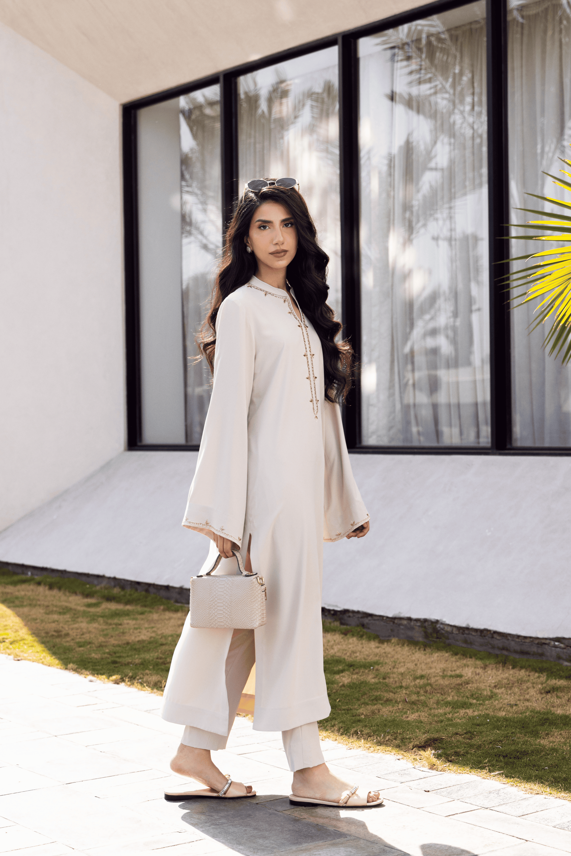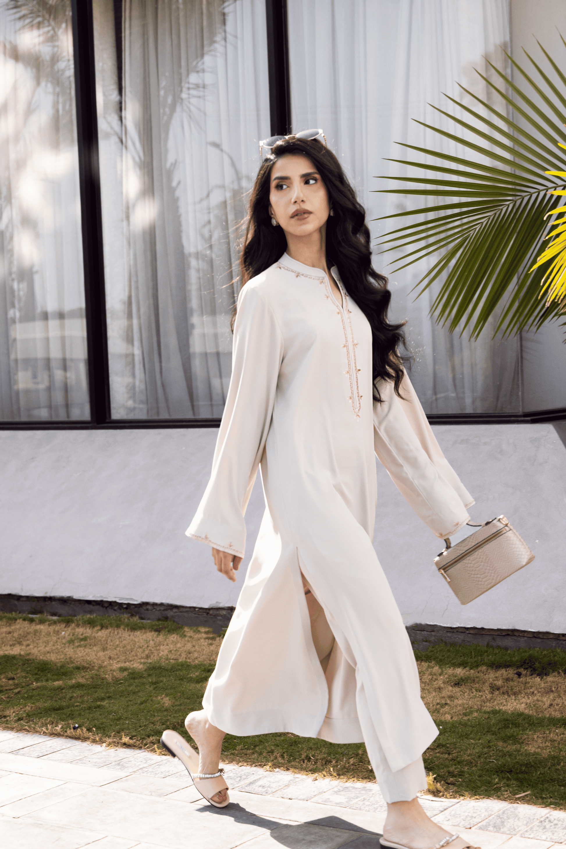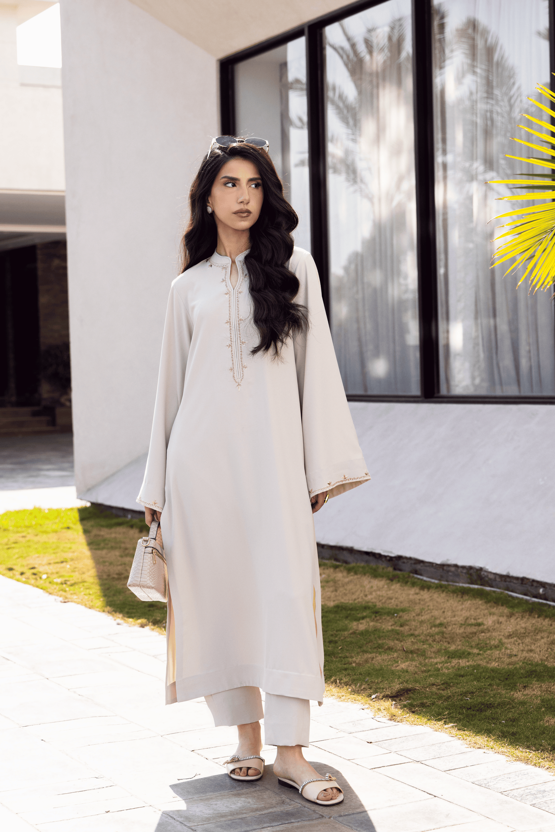 The loose-fit long shirt features fine placket embroidery with delicate sleeve accents, maintaining a harmonious balance between detail and restraint. Paired with straight-cut capri trousers, the silhouette remains elongated and fluid — designed for ease, movement, and refined everyday elegance. A versatile essential that transitions seamlessly from daytime composure to evening poise.