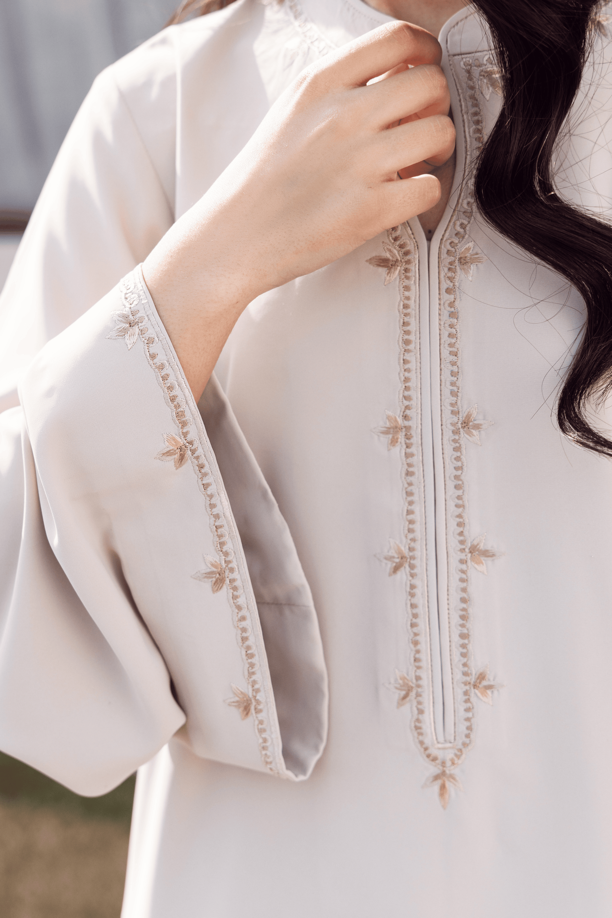 Detailing: Fine embroidery along placket with subtle sleeve accents