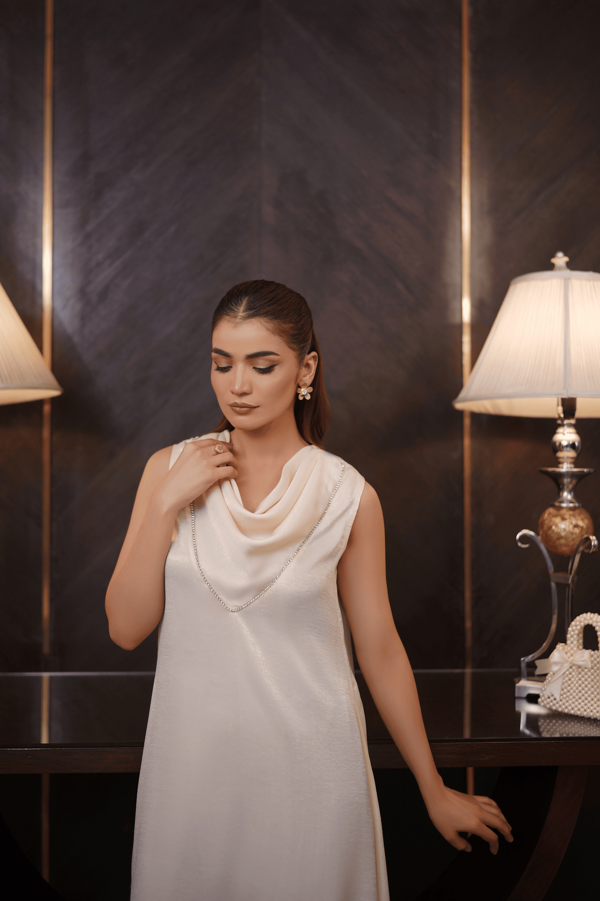 The center-piece of this design is the asymmetrical draped cowl neckline, which flows elegantly across the chest and shoulder. The cowl is beautifully accented with delicate crystal embellishments along the edge, adding a hint of sparkle that elevates the look to formal perfection.