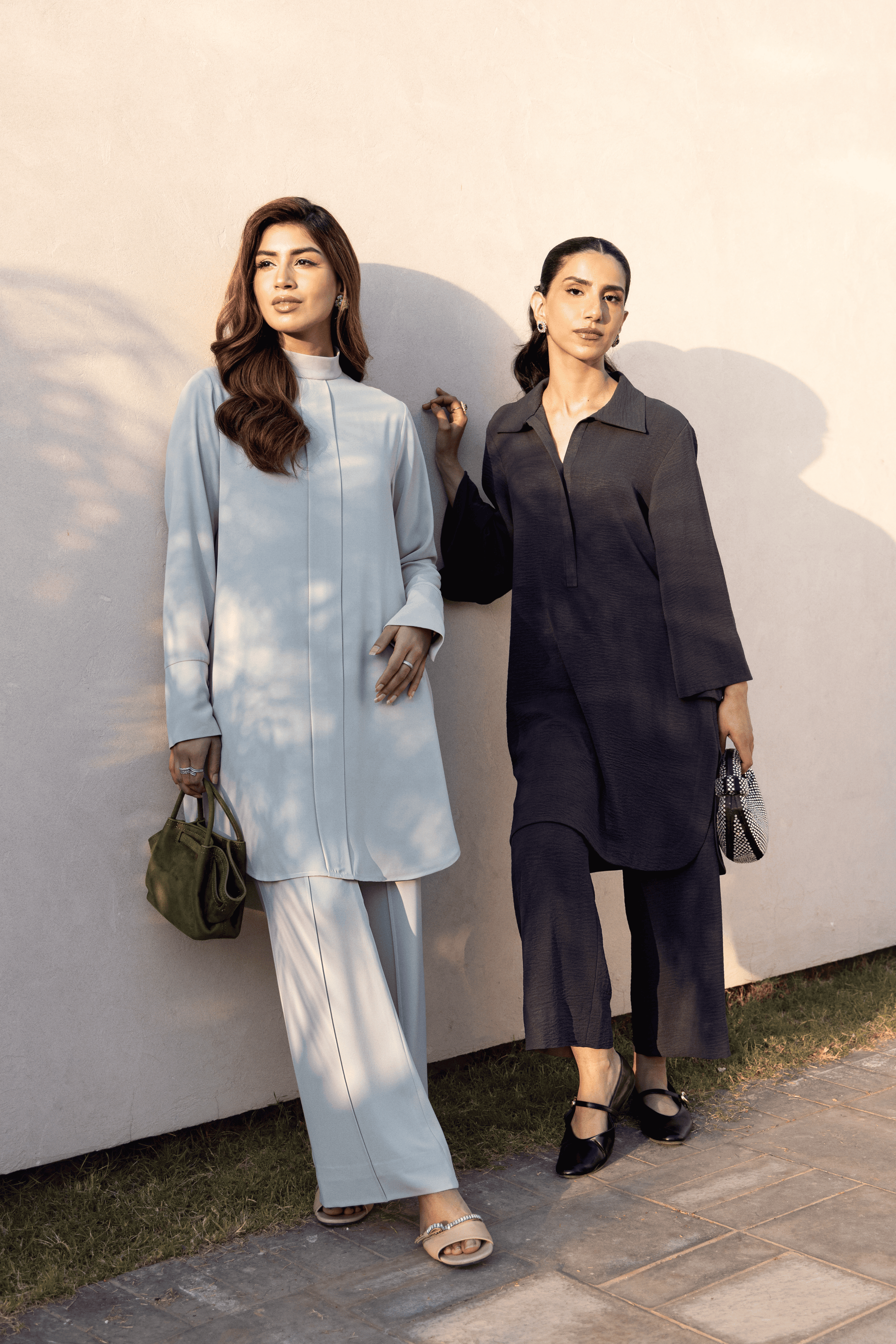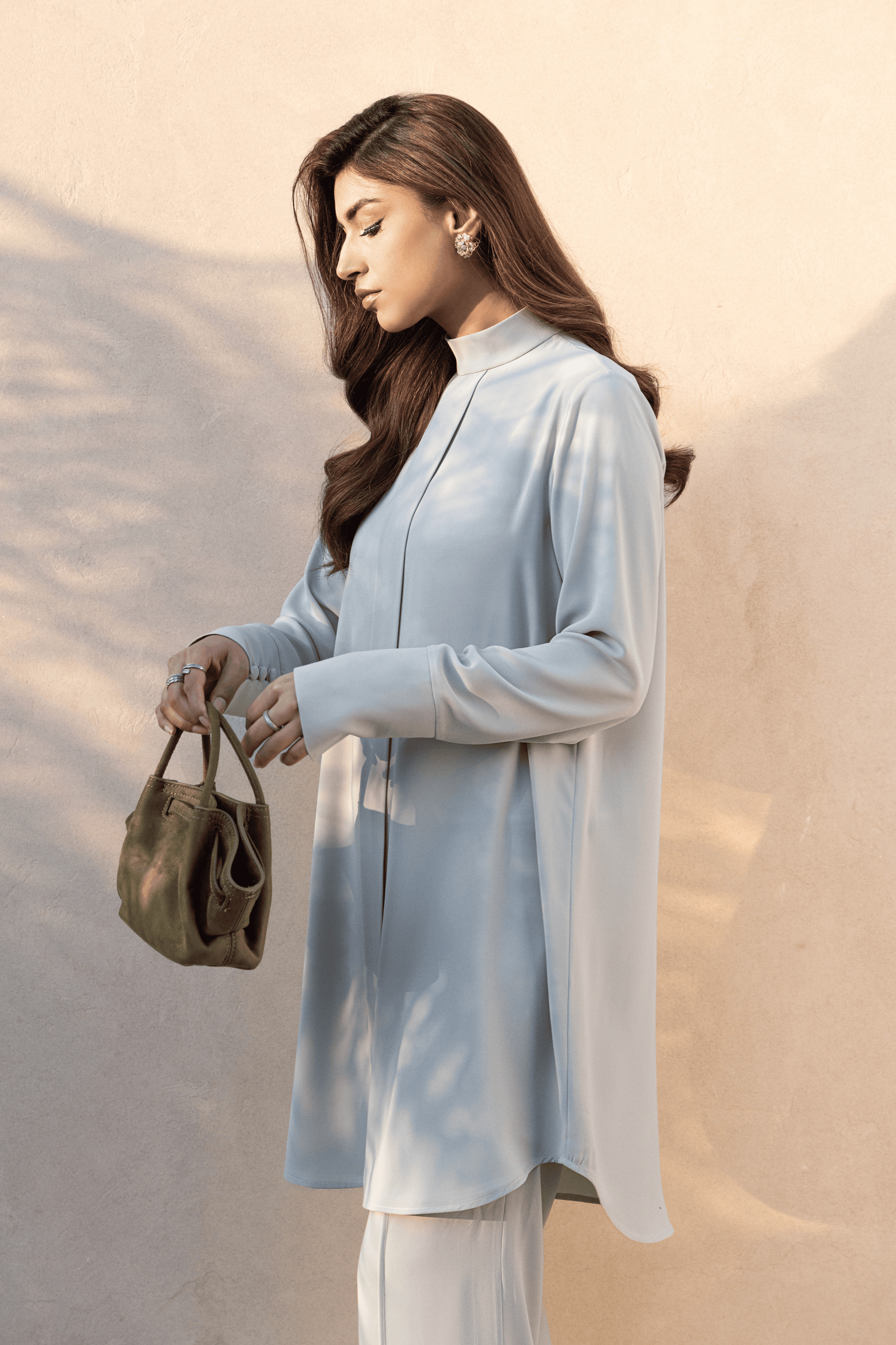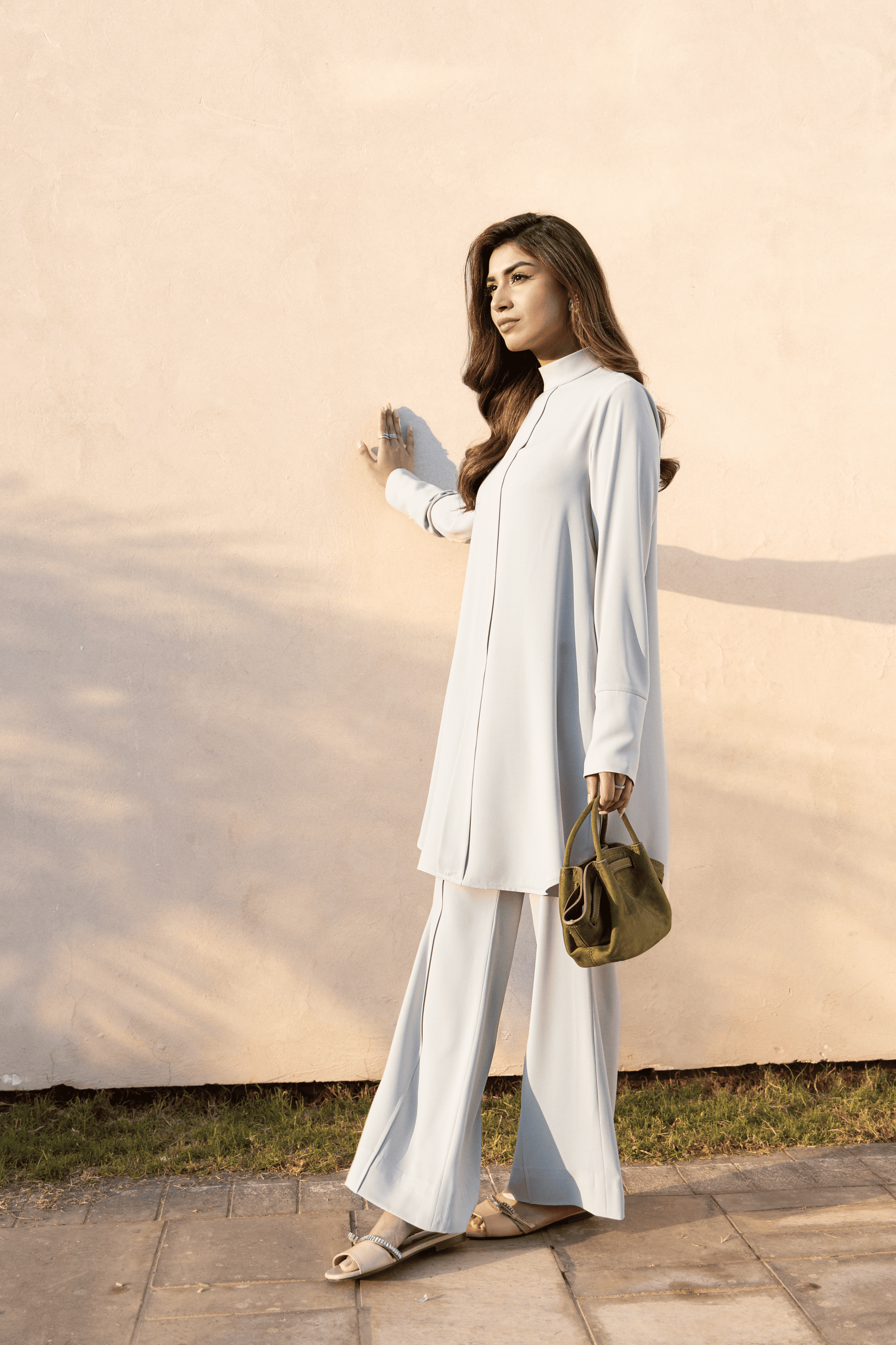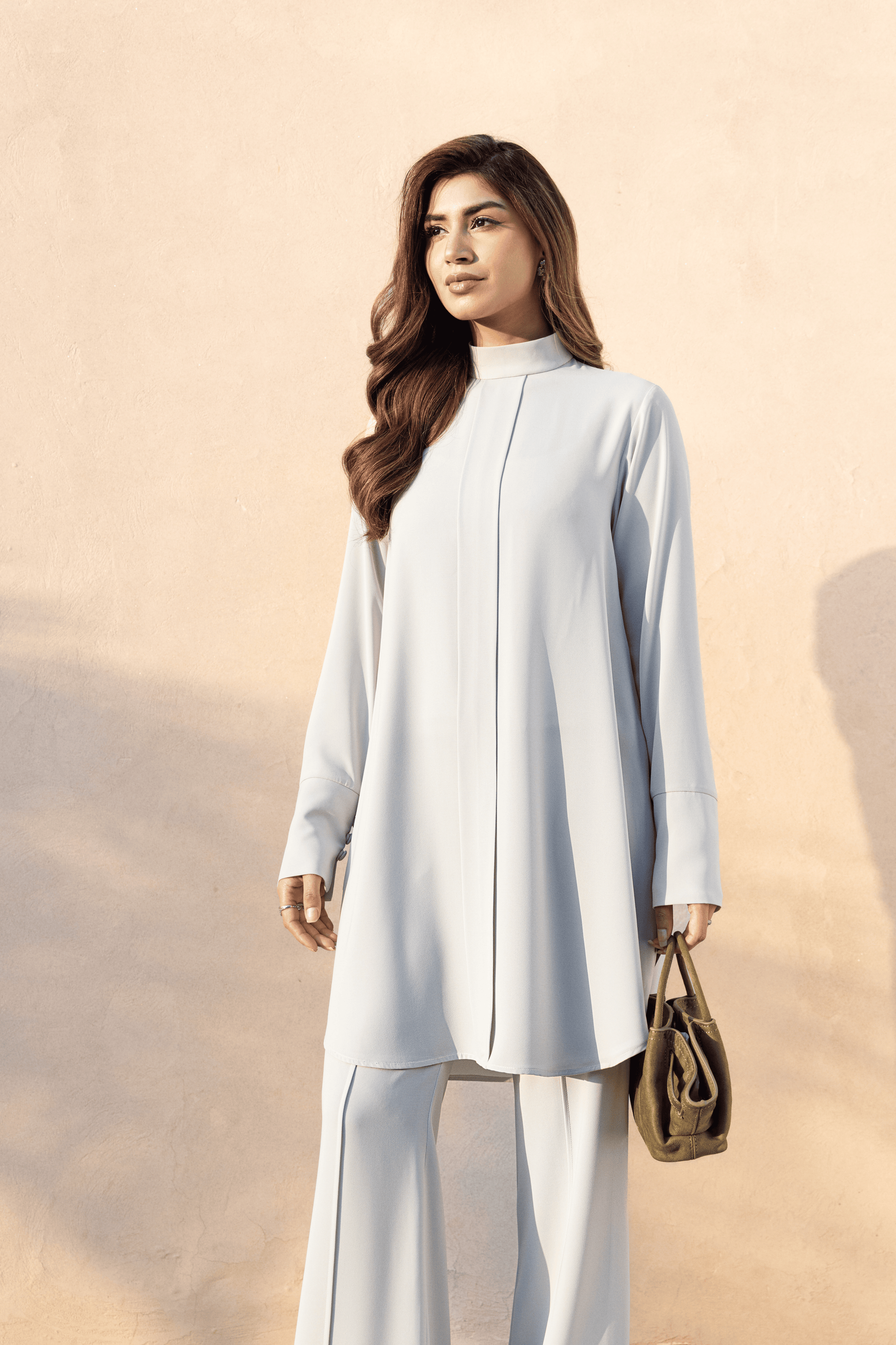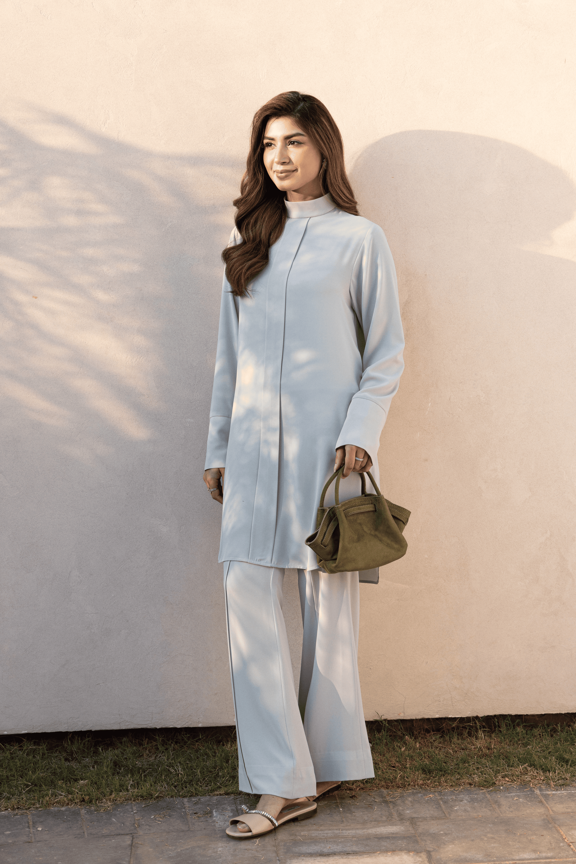 Rendered in a muted sage-grey, Sage Poise Set is a study in restraint and structure. The sharp tailoring and clean lines create an effortlessly sophisticated silhouette. The high mock-neck collar frames the form with confidence, while a concealed placket maintains a seamless, uninterrupted front. Elongated cuffs are finished with a refined row of tonal fabric-covered buttons — a subtle detail highlighting craftsmanship over excess. Paired with bell-bottom trousers, the ensemble is composed, polished, and powerfully modern.