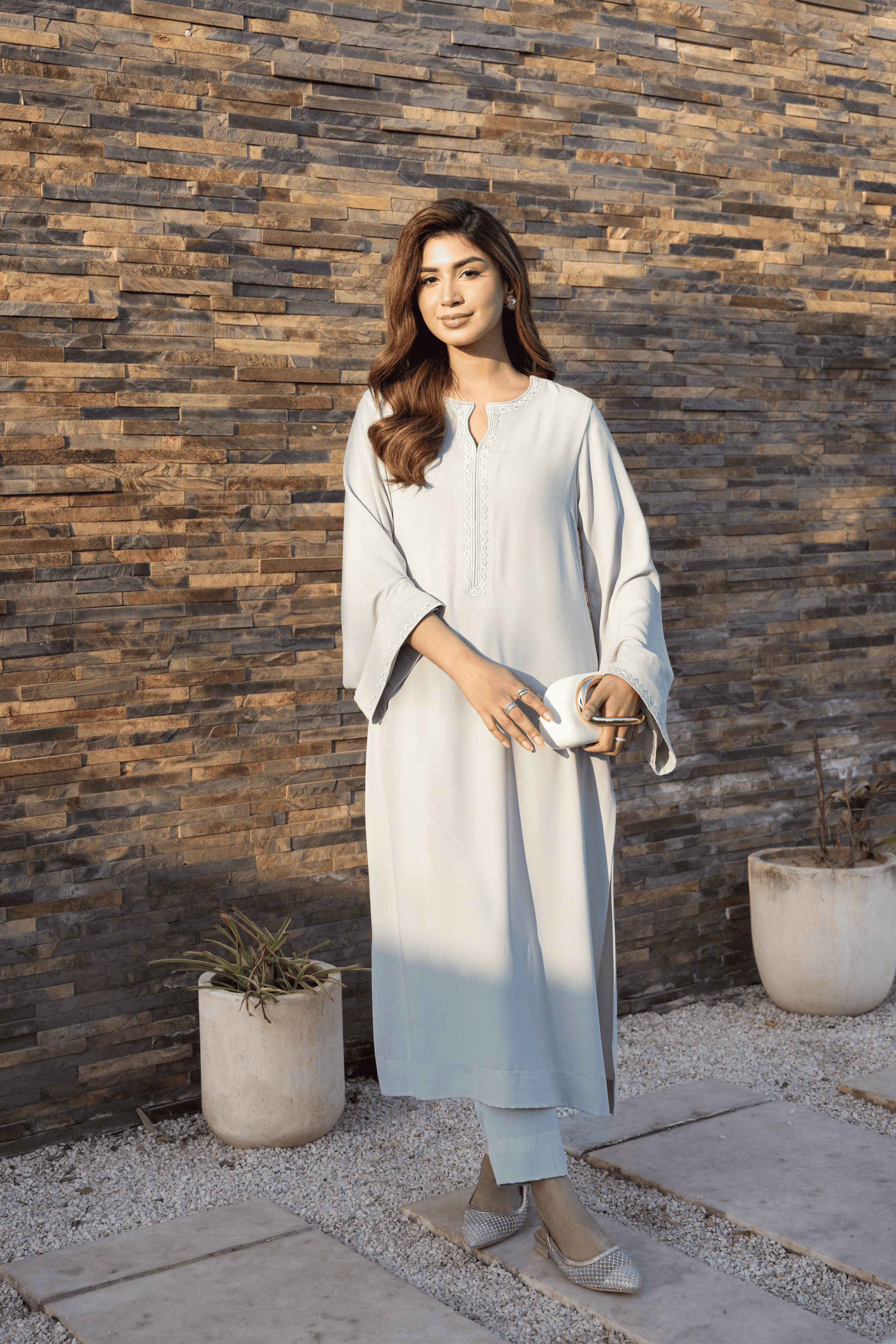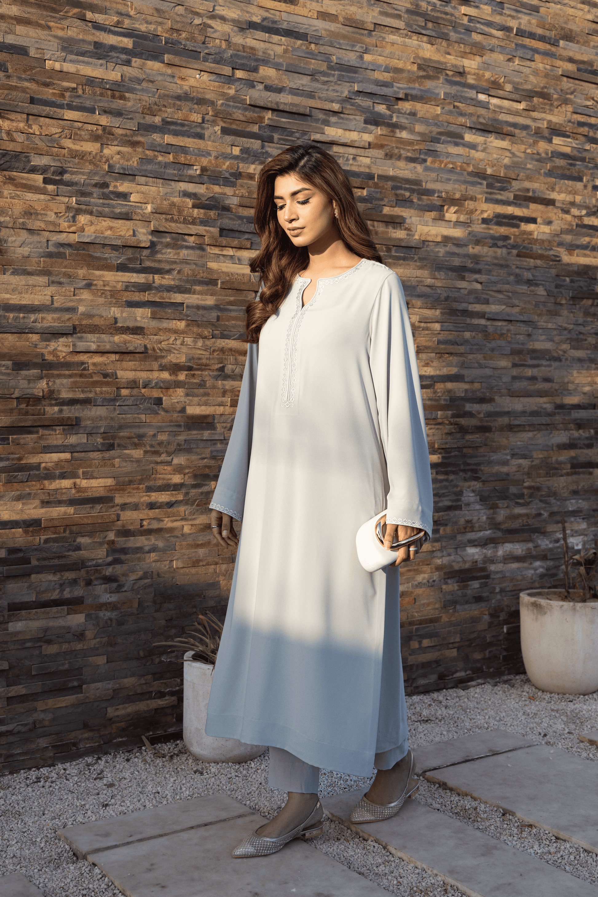 Rendered in a soft sage green, Sage Whisper Set reflects serene sophistication with a light, graceful presence. The loose-fit long shirt features a delicate keyhole neckline with a central faux-placket, accented by geometric embroidery along the neckline and sleeve edges.