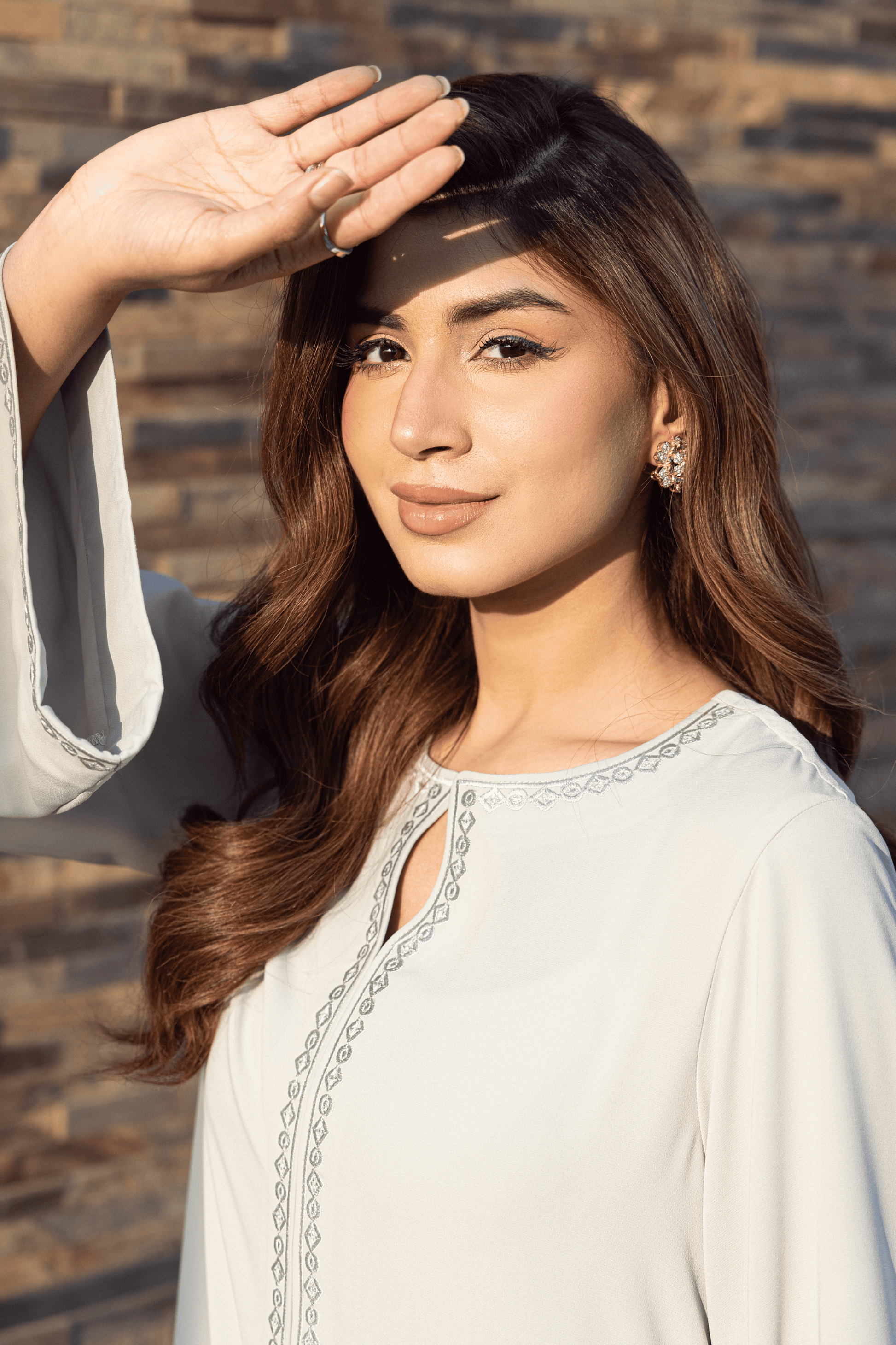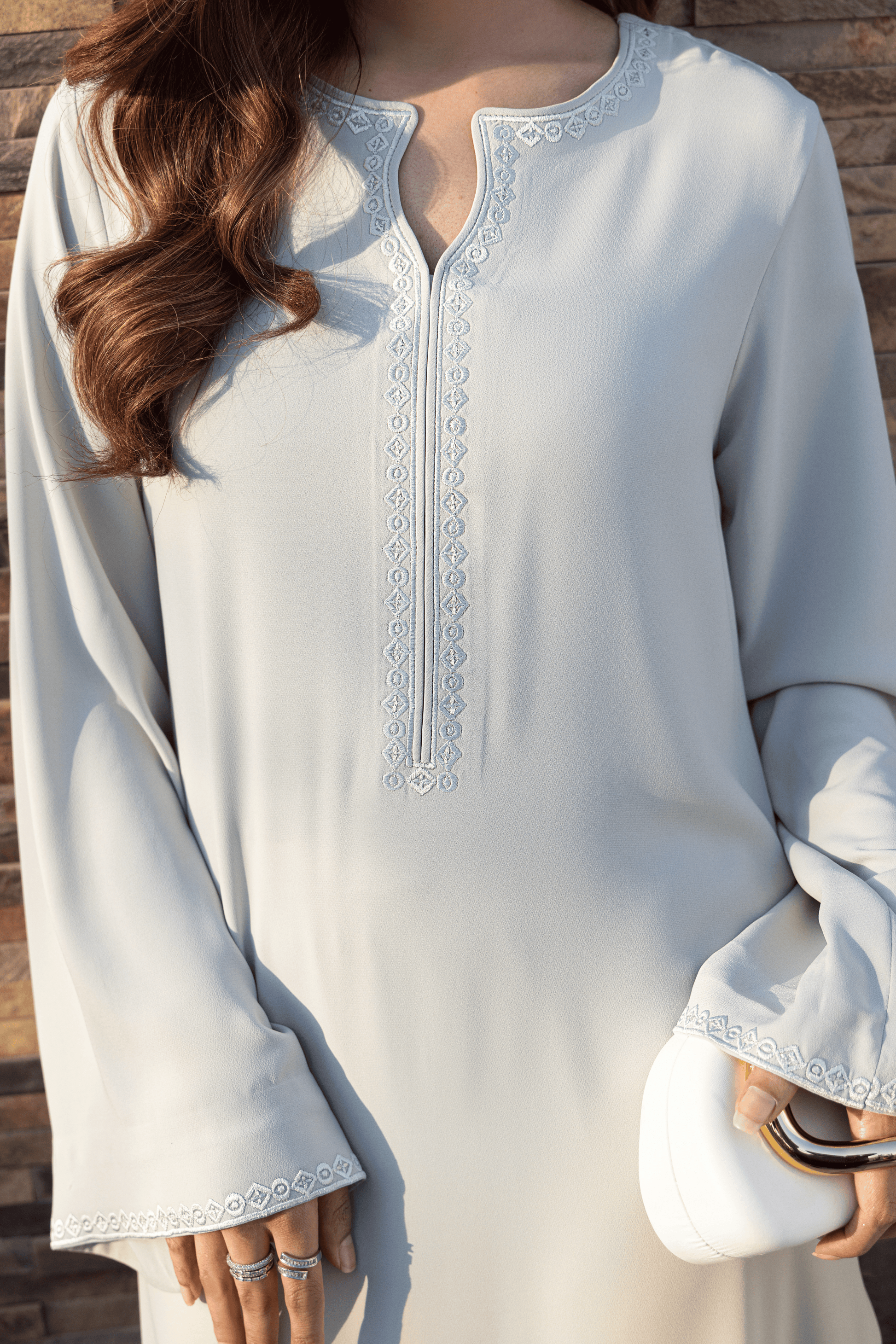 Detailing: Geometric embroidery along neckline and sleeve edges