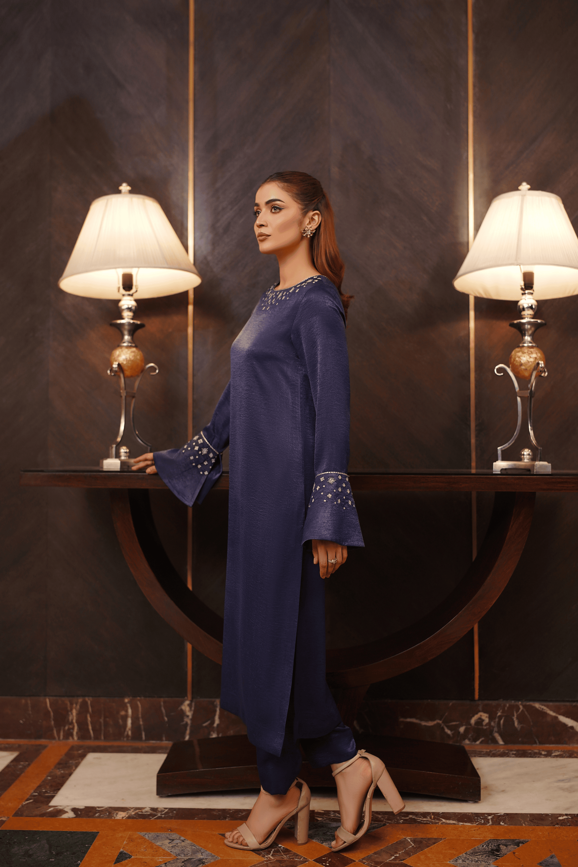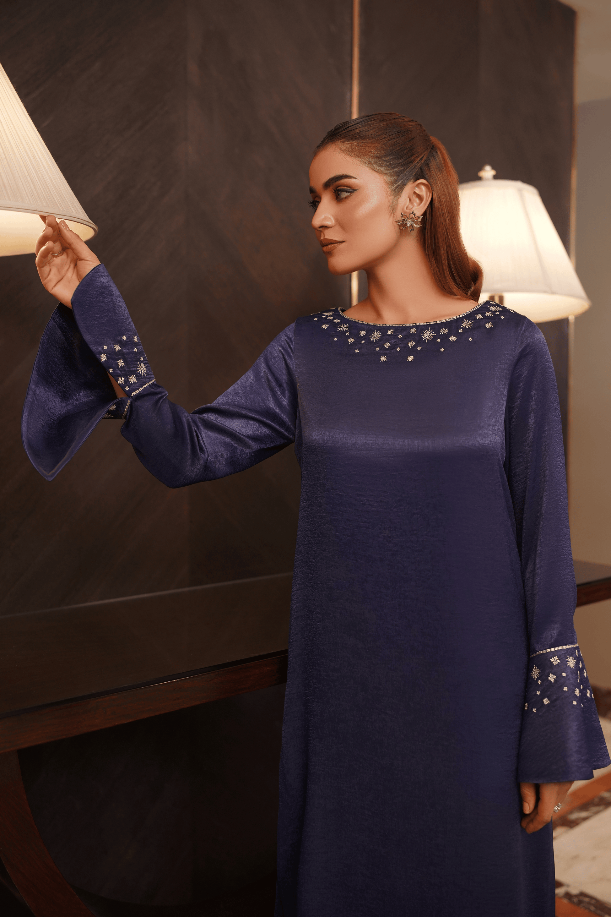 Dramatic jewel-toned elegance with sparkling accents and flared silhouettes. The design is elevated by intricate, hand-placed crystal or silver thread embellishments that trail beautifully along the round neckline. The standout feature is the unique flared or bell sleeve, which begins just above the elbow and dramatically opens out, finished perfectly with coordinating embellishment work at the hem and wrist area. This luminous tunic is ideal for semi-formal gatherings, evening parties, or any occasion requiring a touch of refined glamour and a memorable silhouette.