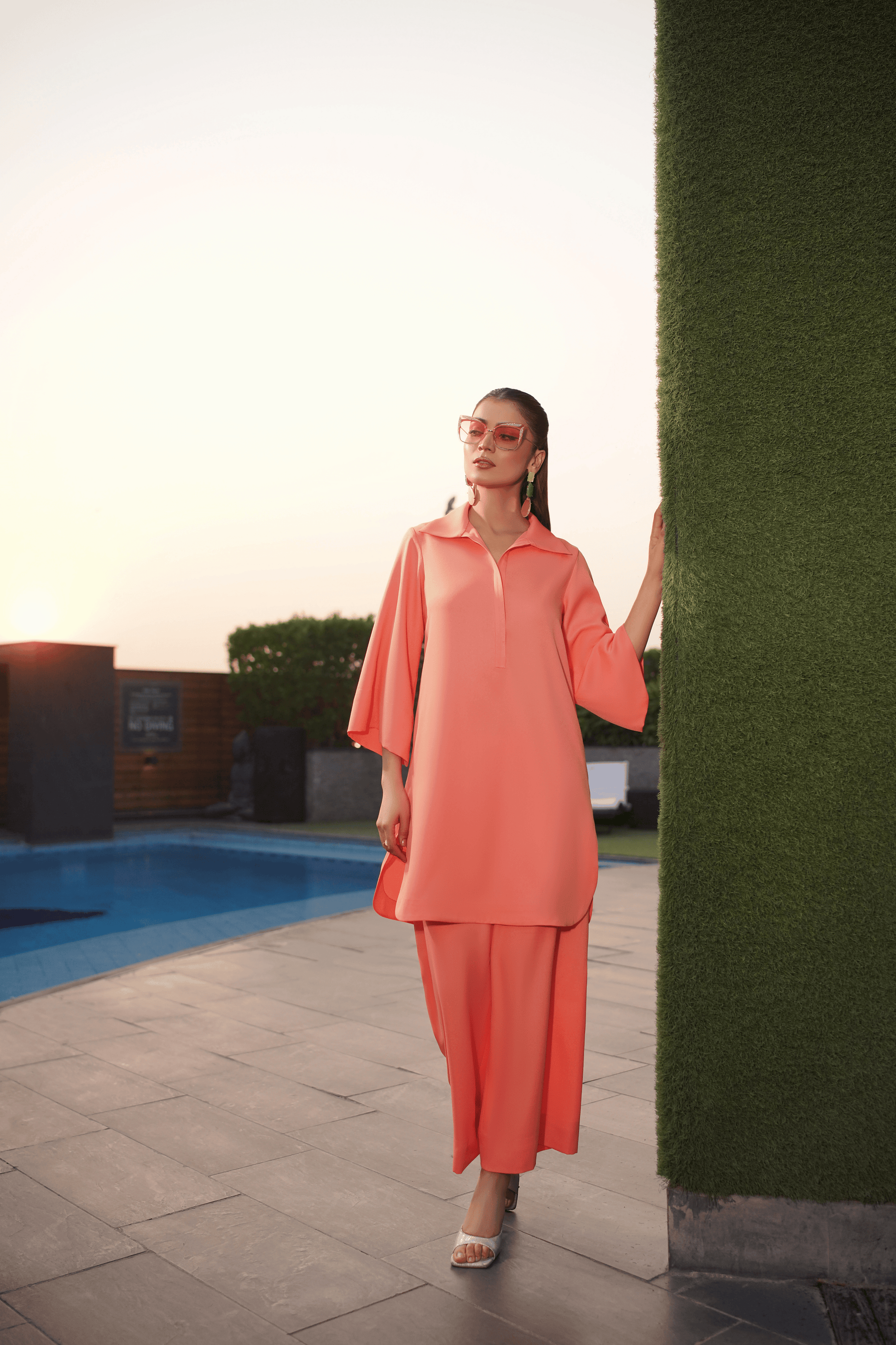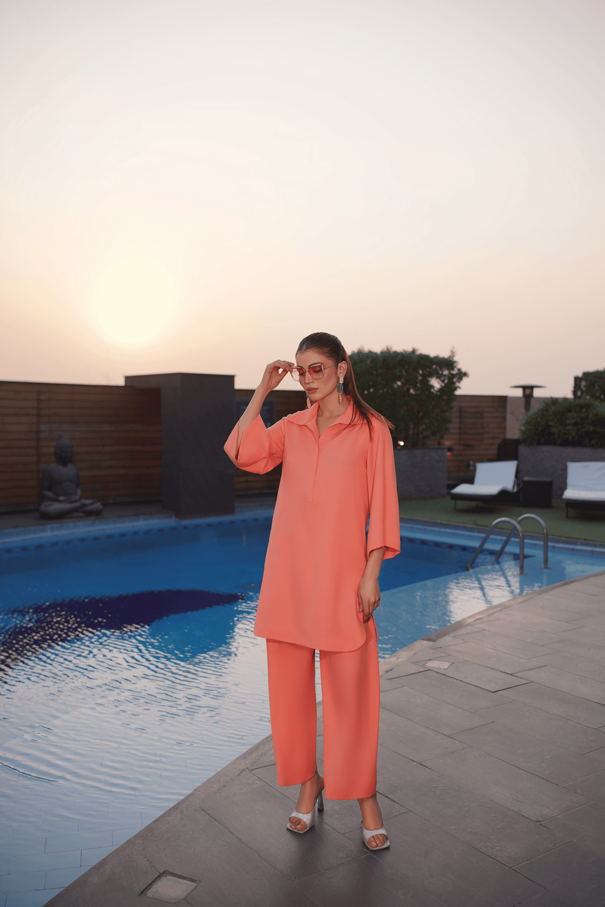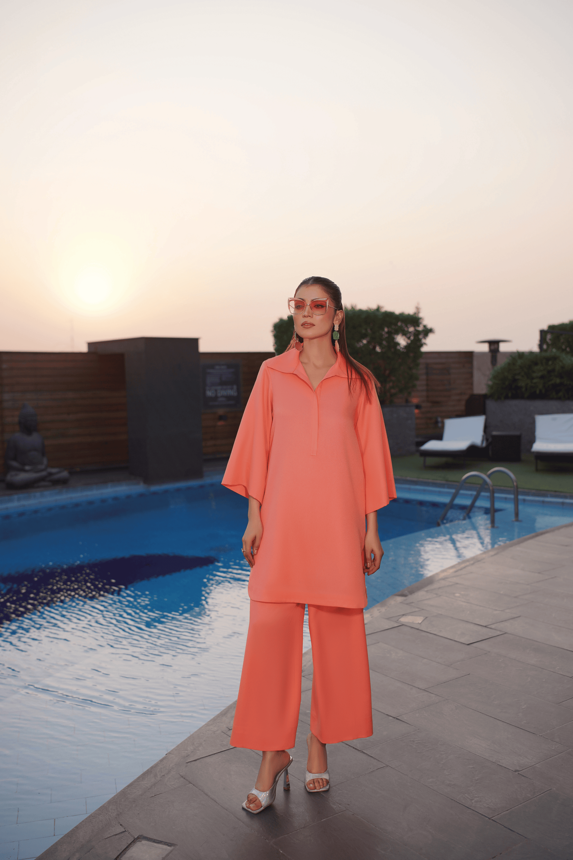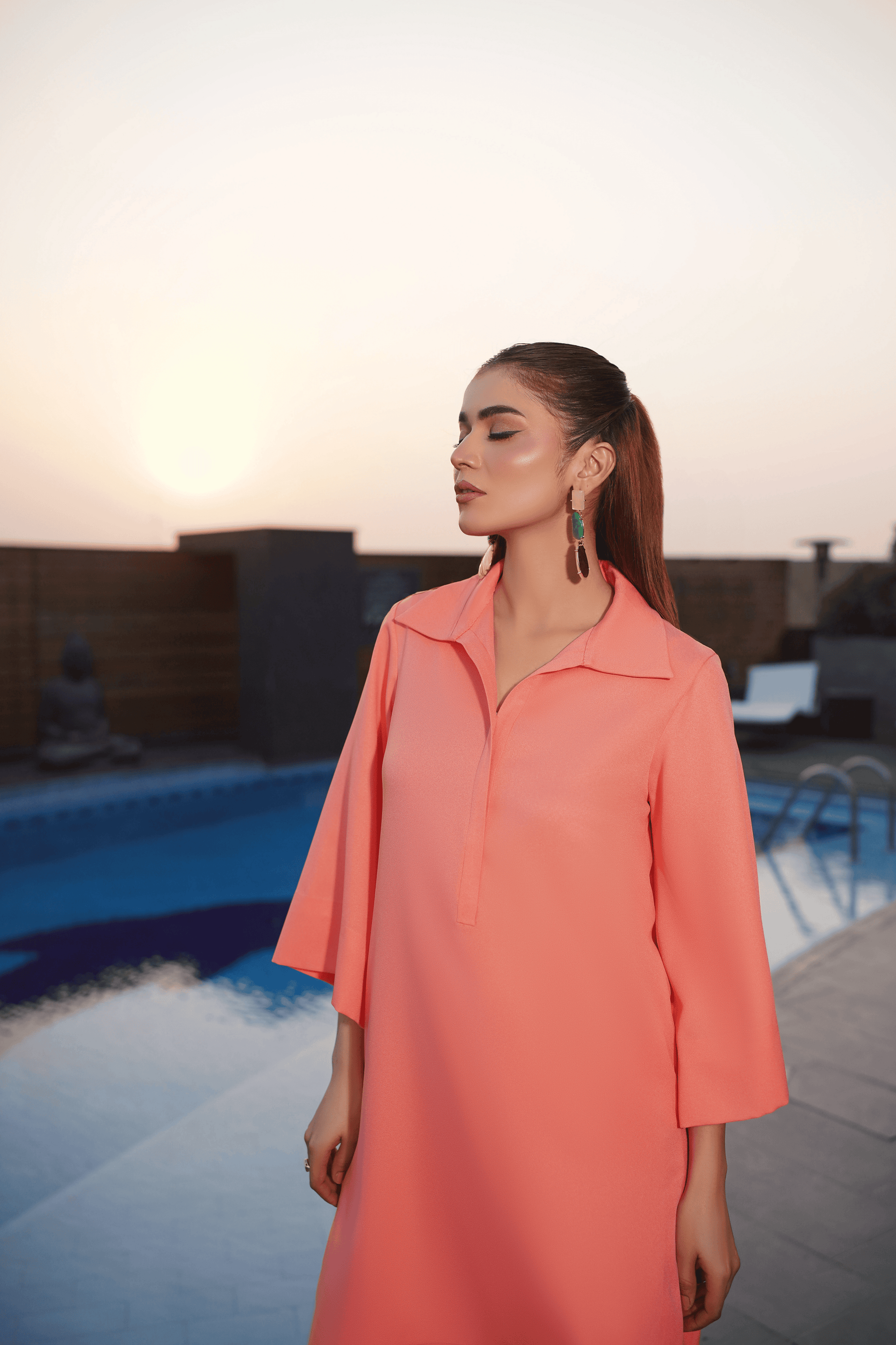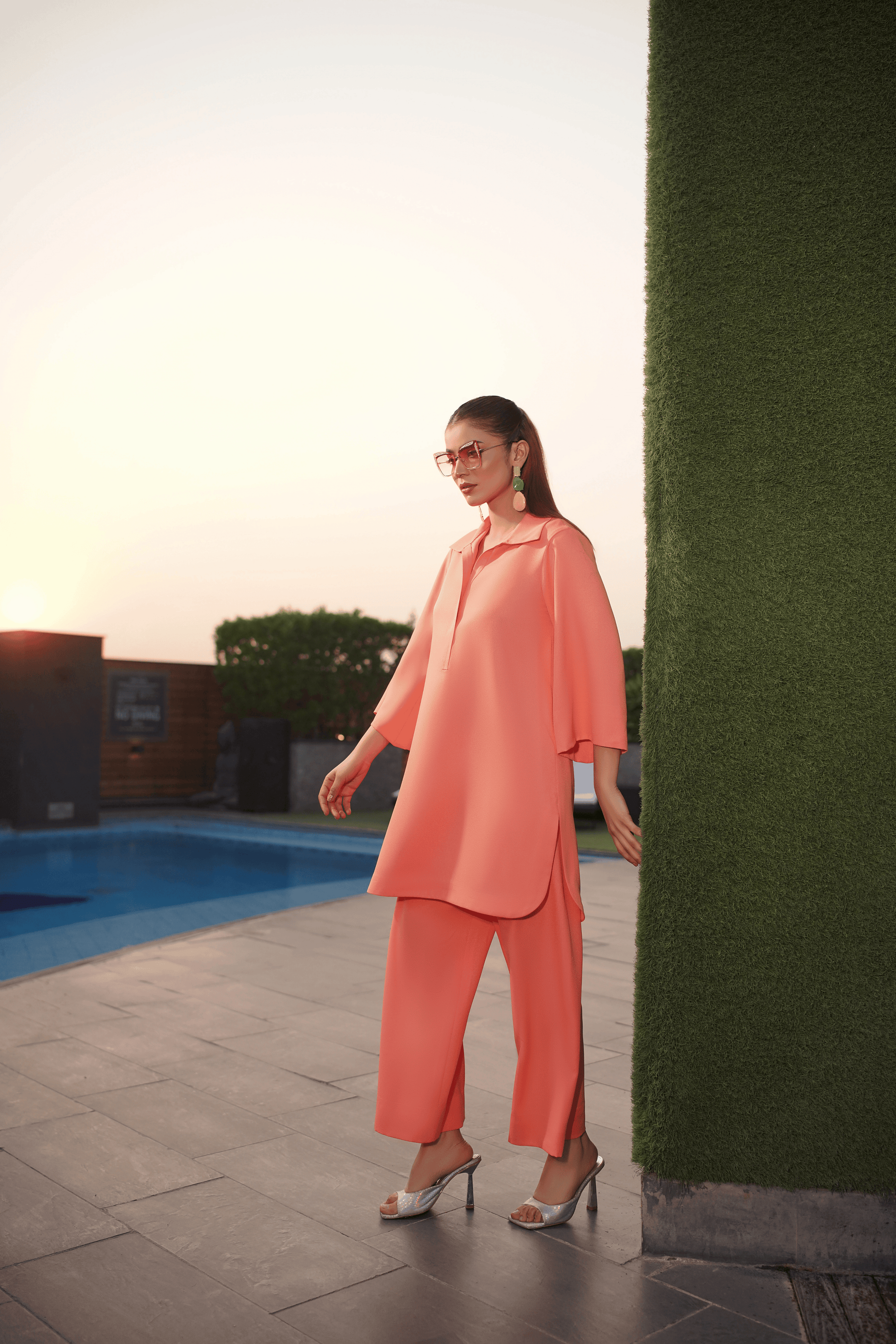 Confection: The tunic is cut short in a relaxed, boxy silhouette, featuring a wide camp collar and a classic polo-style V-neck placket with tonal button detailing. The sleeves are wide and fall to an elbow length, lending a retro, easy-going feel.