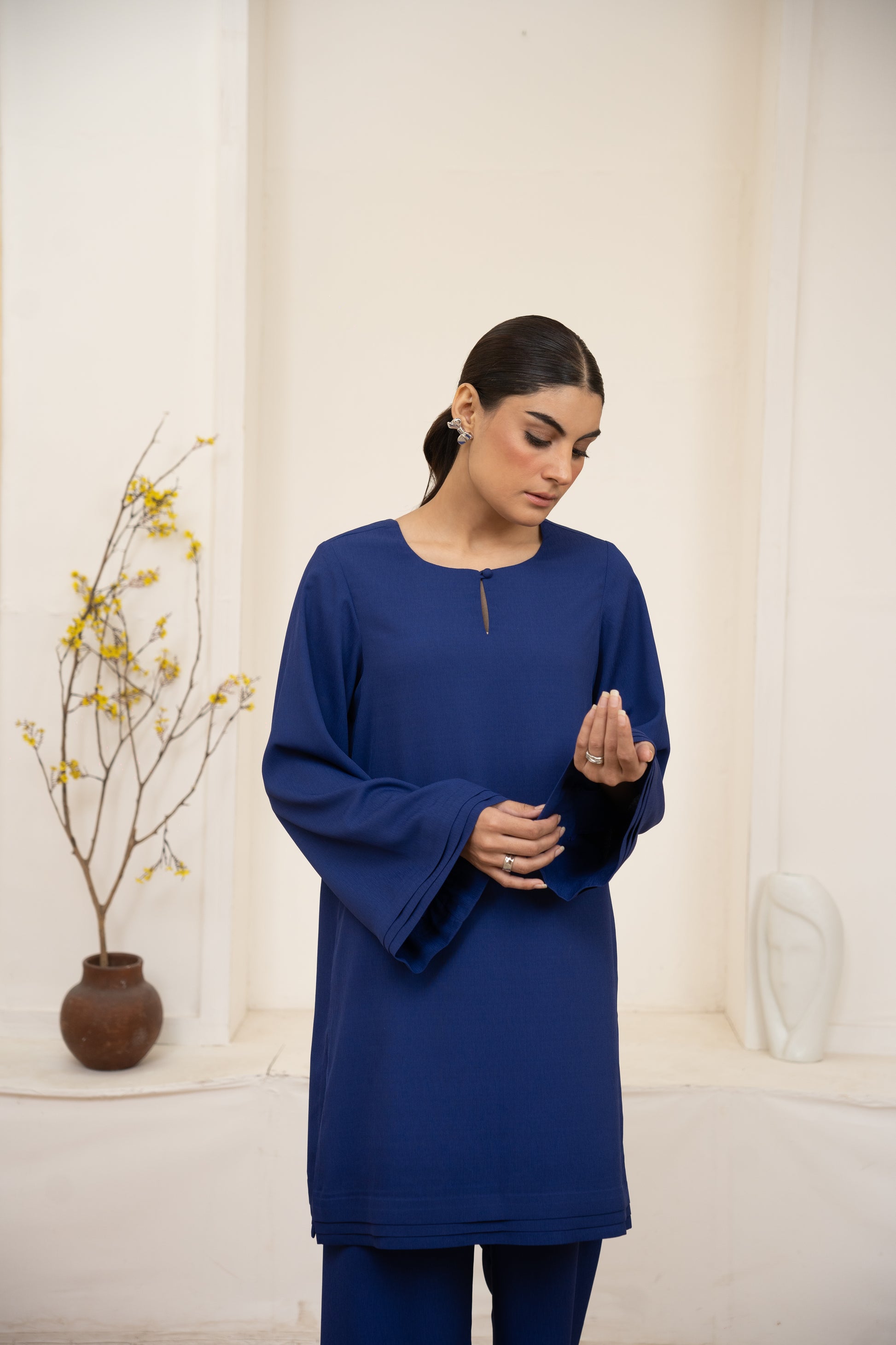 Confection: Two-piece regular-fit set with loop button neckline, pleated sleeves, pleated daman, and straight trouser with pleated hem.