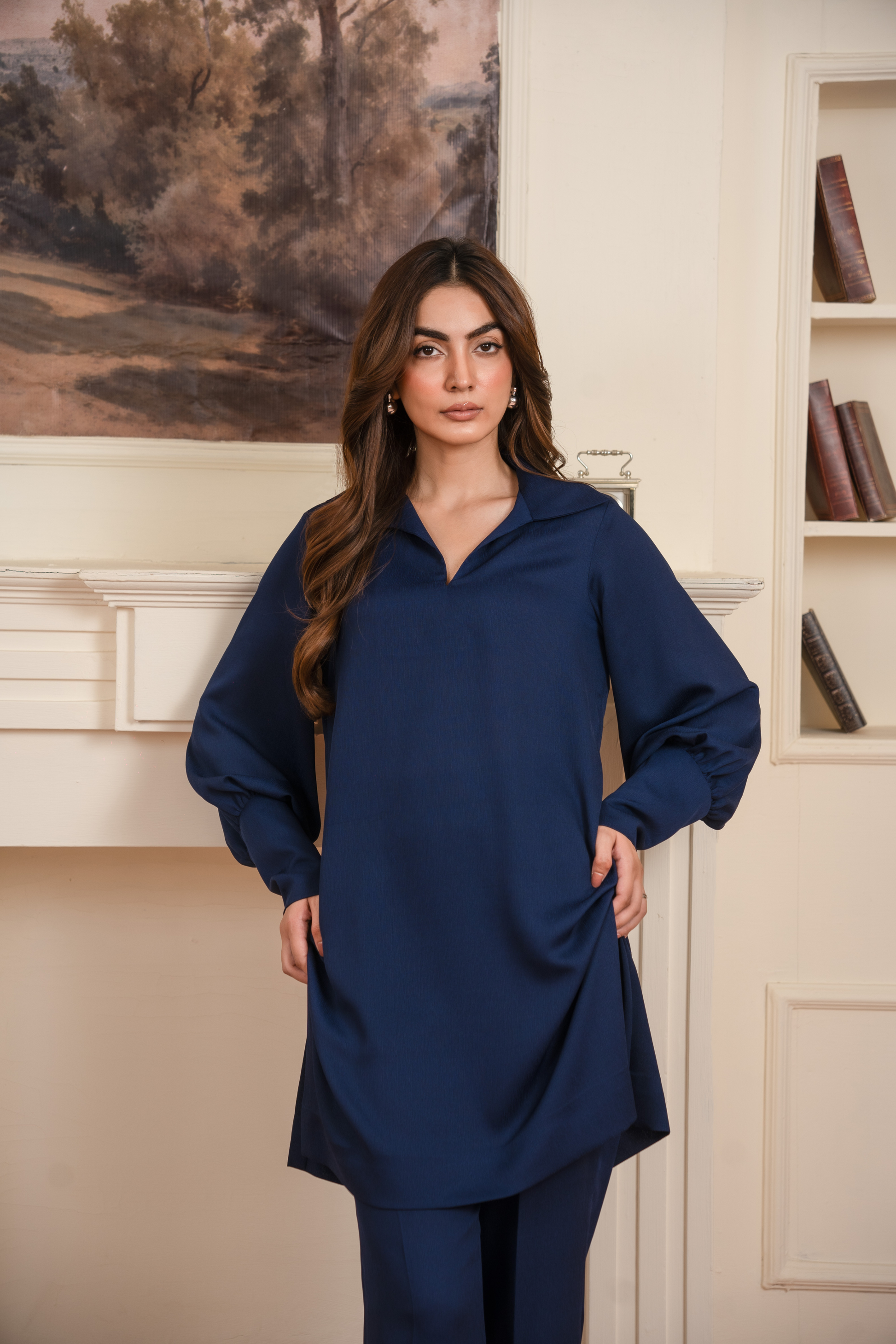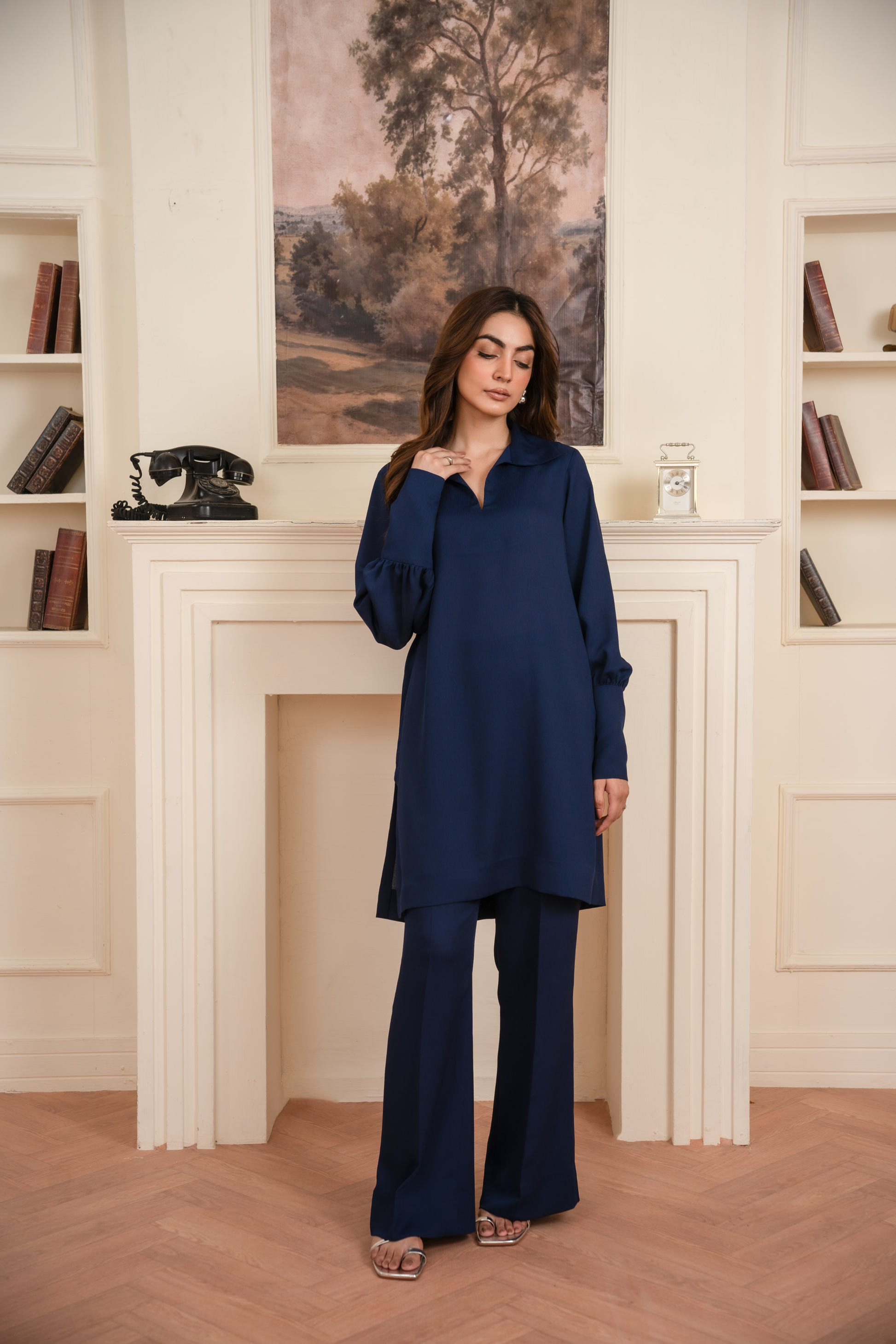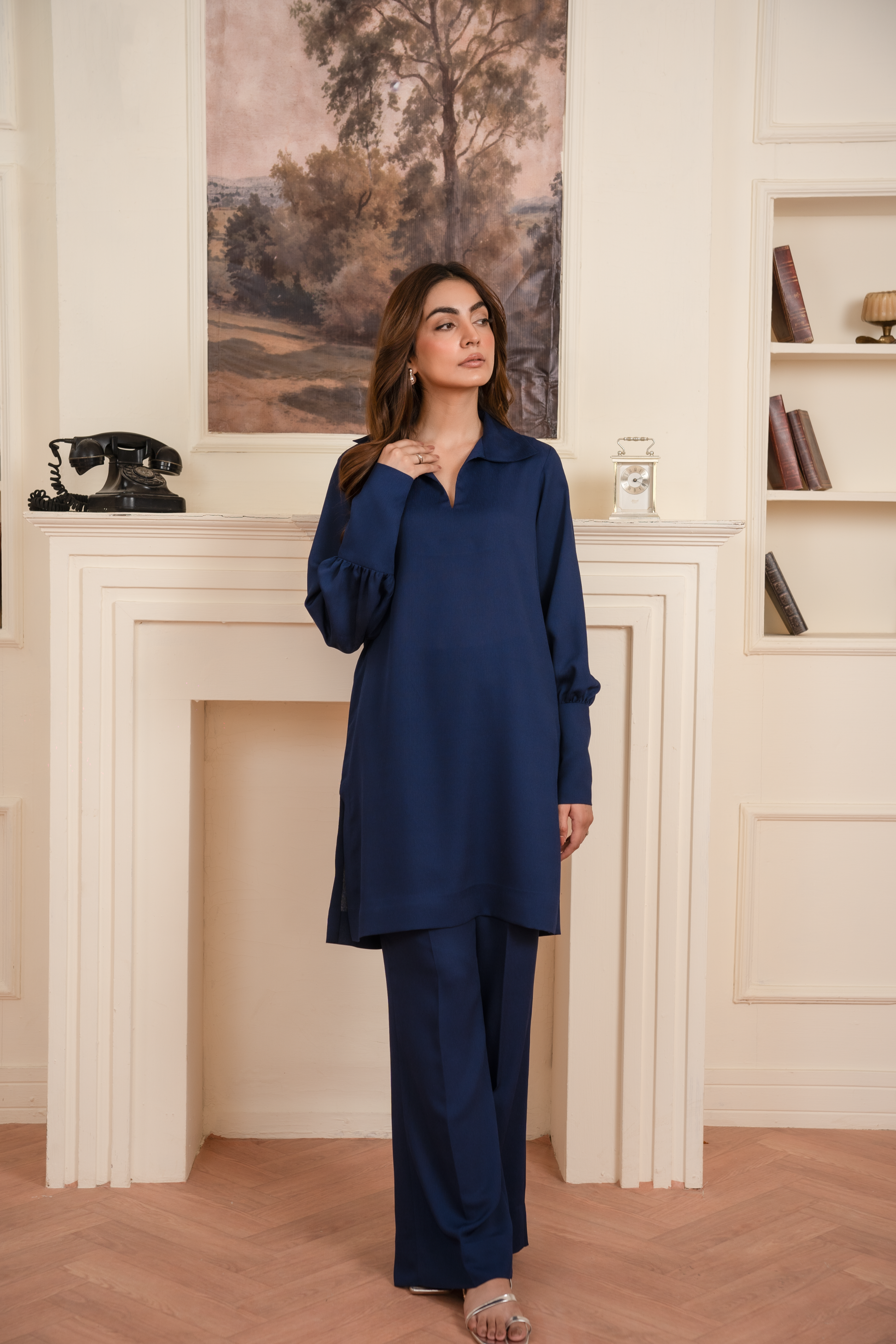 Confection: Two-piece set featuring a loose-fit shirt with culotte trousers, designed with a split neckline collar for an effortlessly refined look.