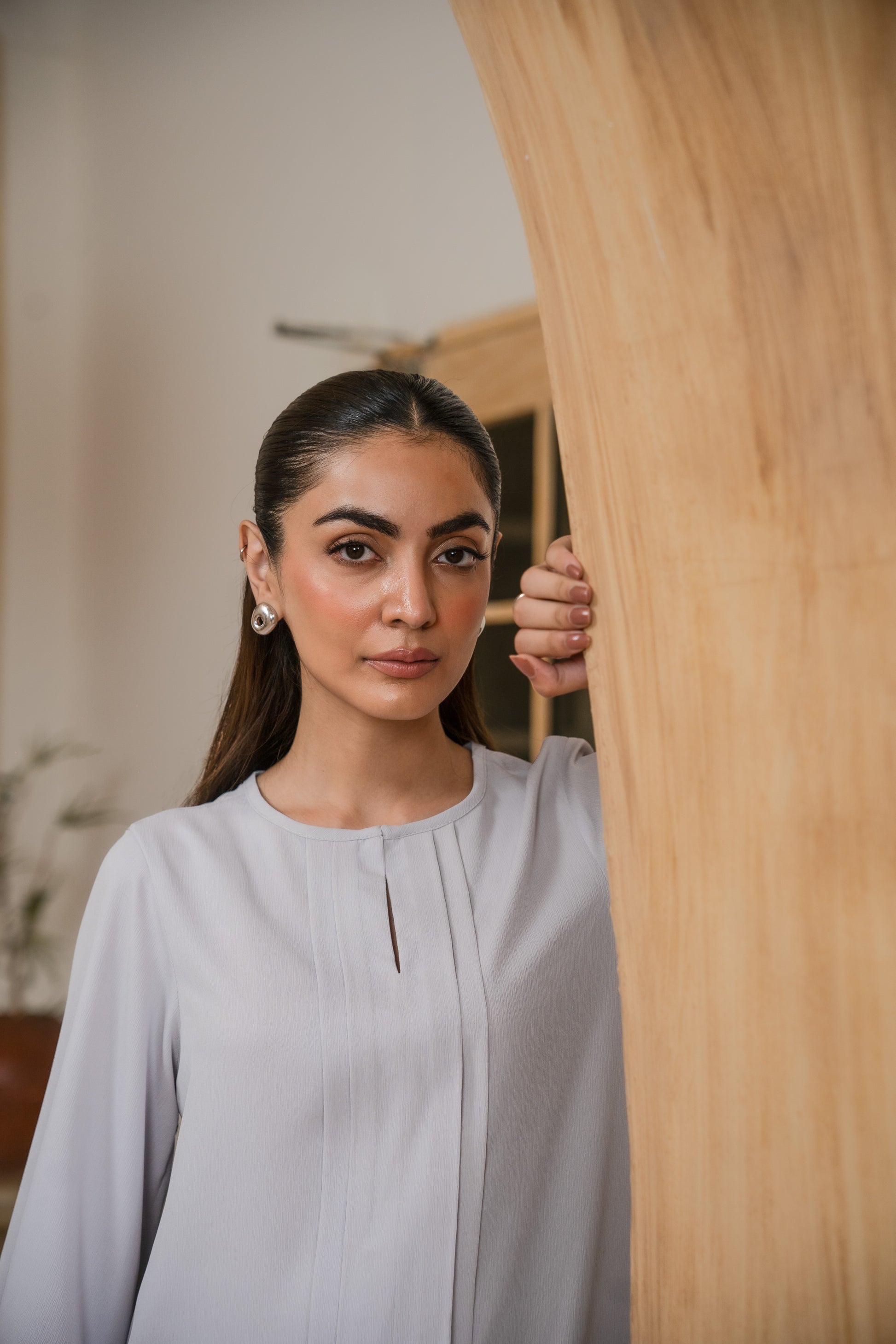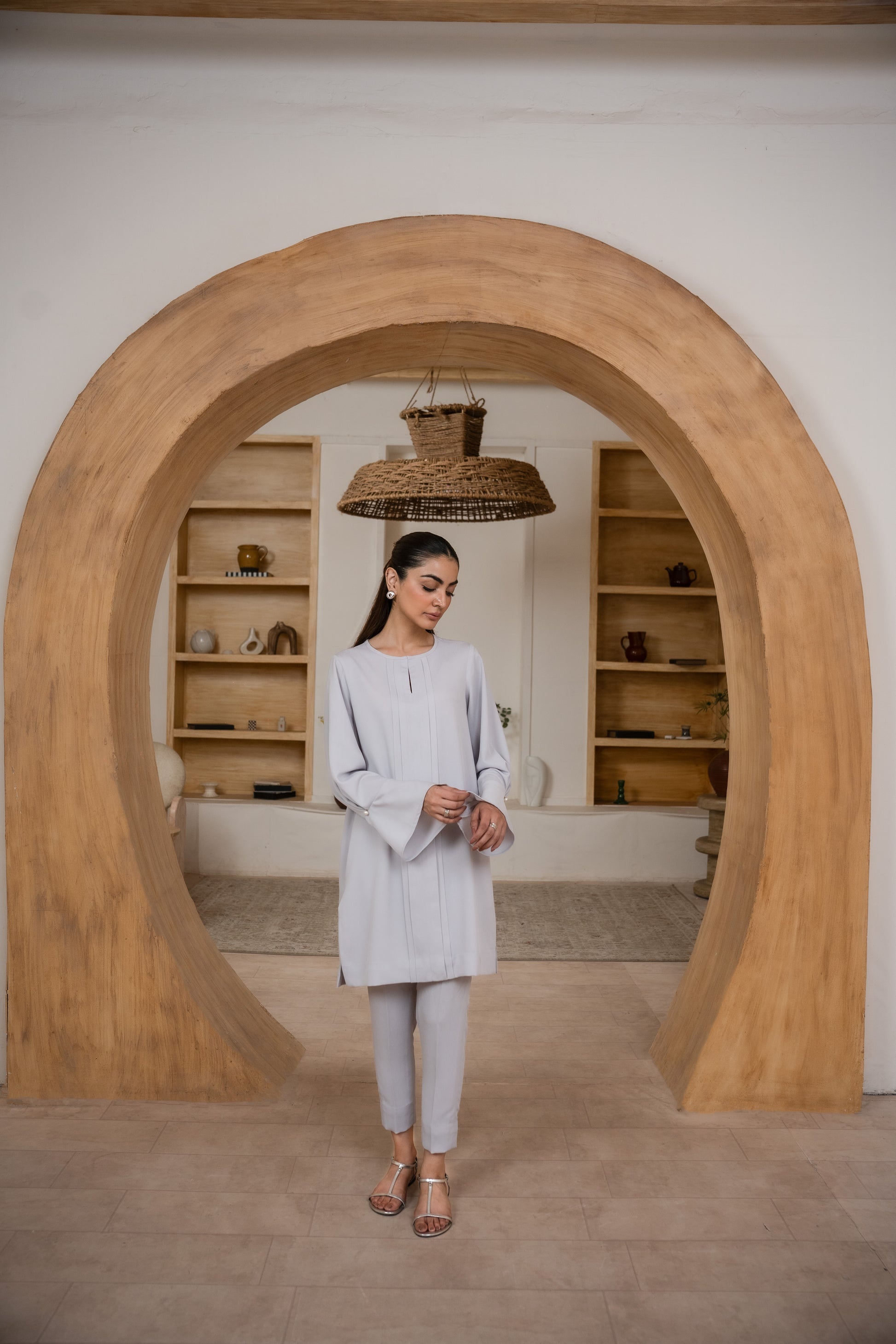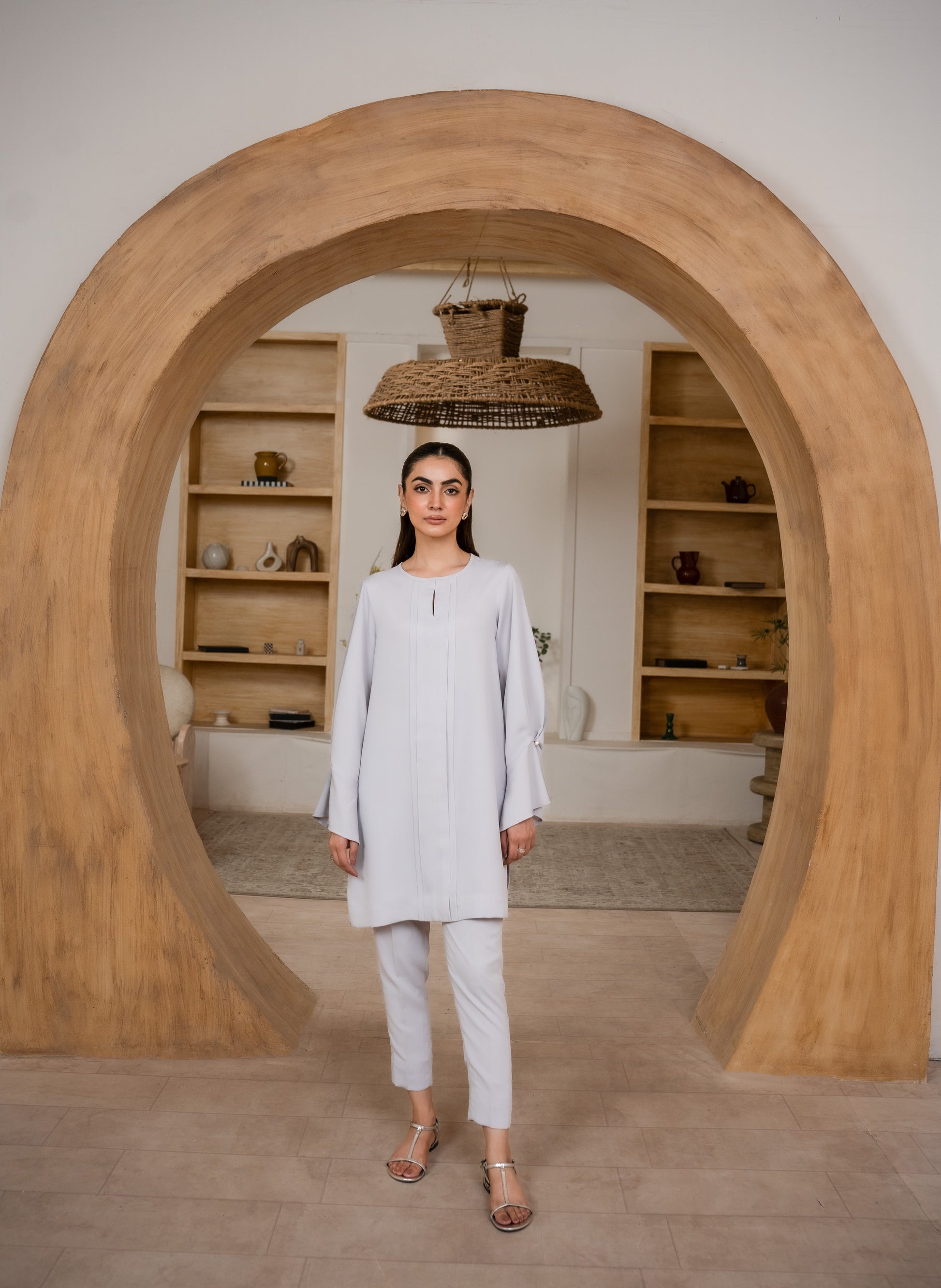 The quiet harmony of dusk, structured by clean lines and subtle pleats.