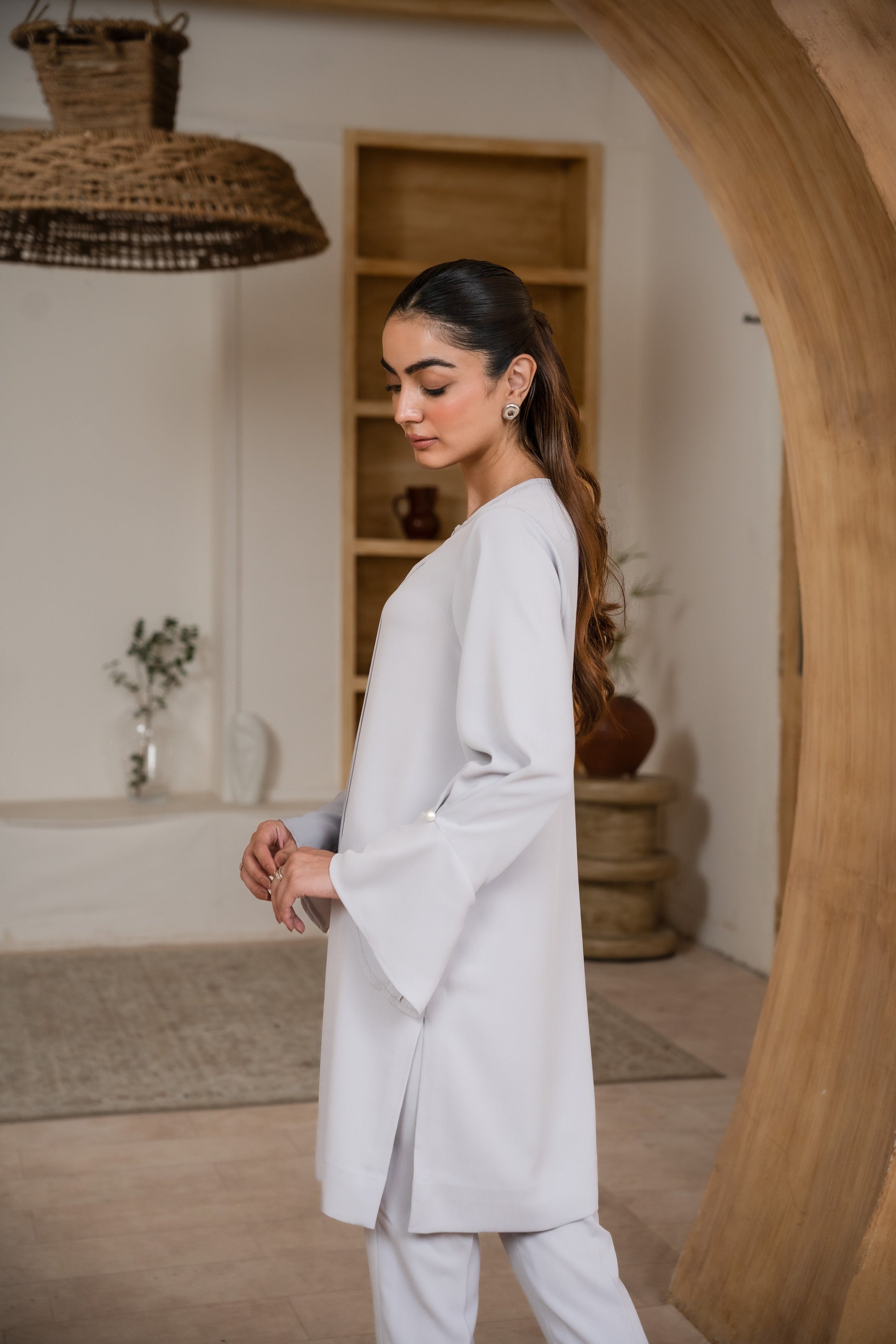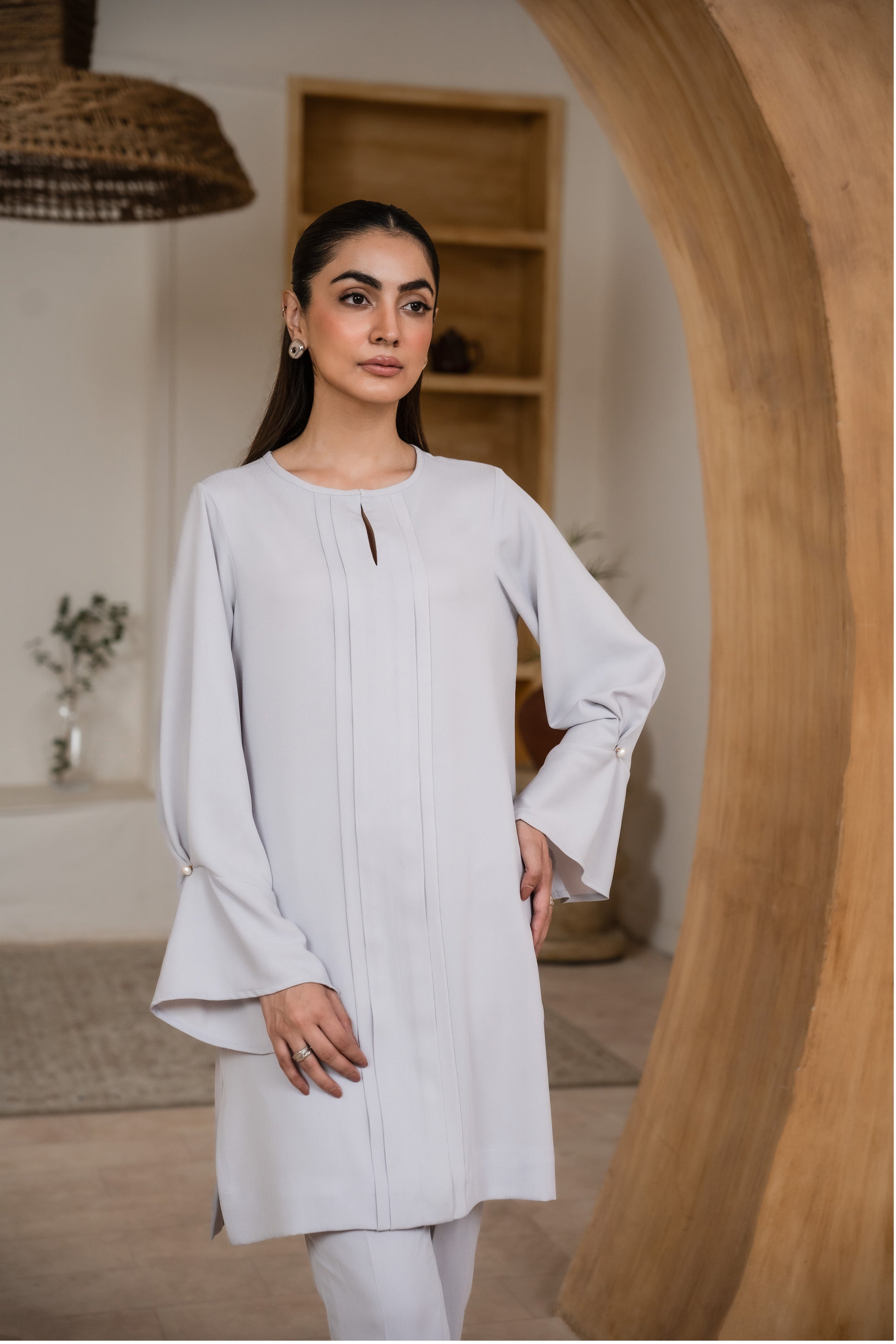 Confection: Two Pcs Regular fit Shirt with Capri Trouser, Center pleated, Tucked Funnel Sleeves with Pearl.